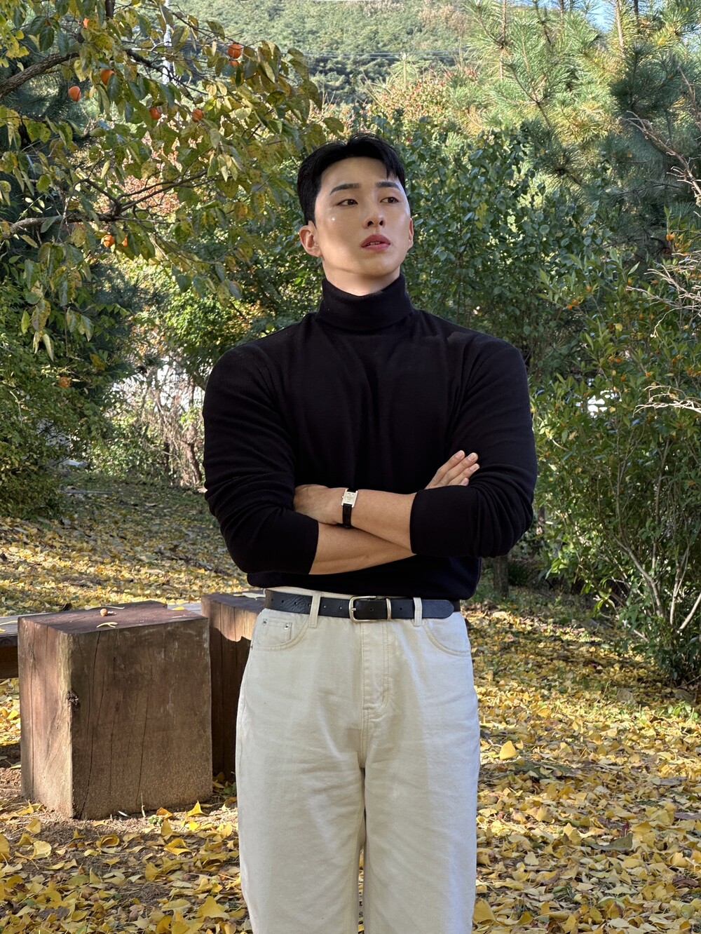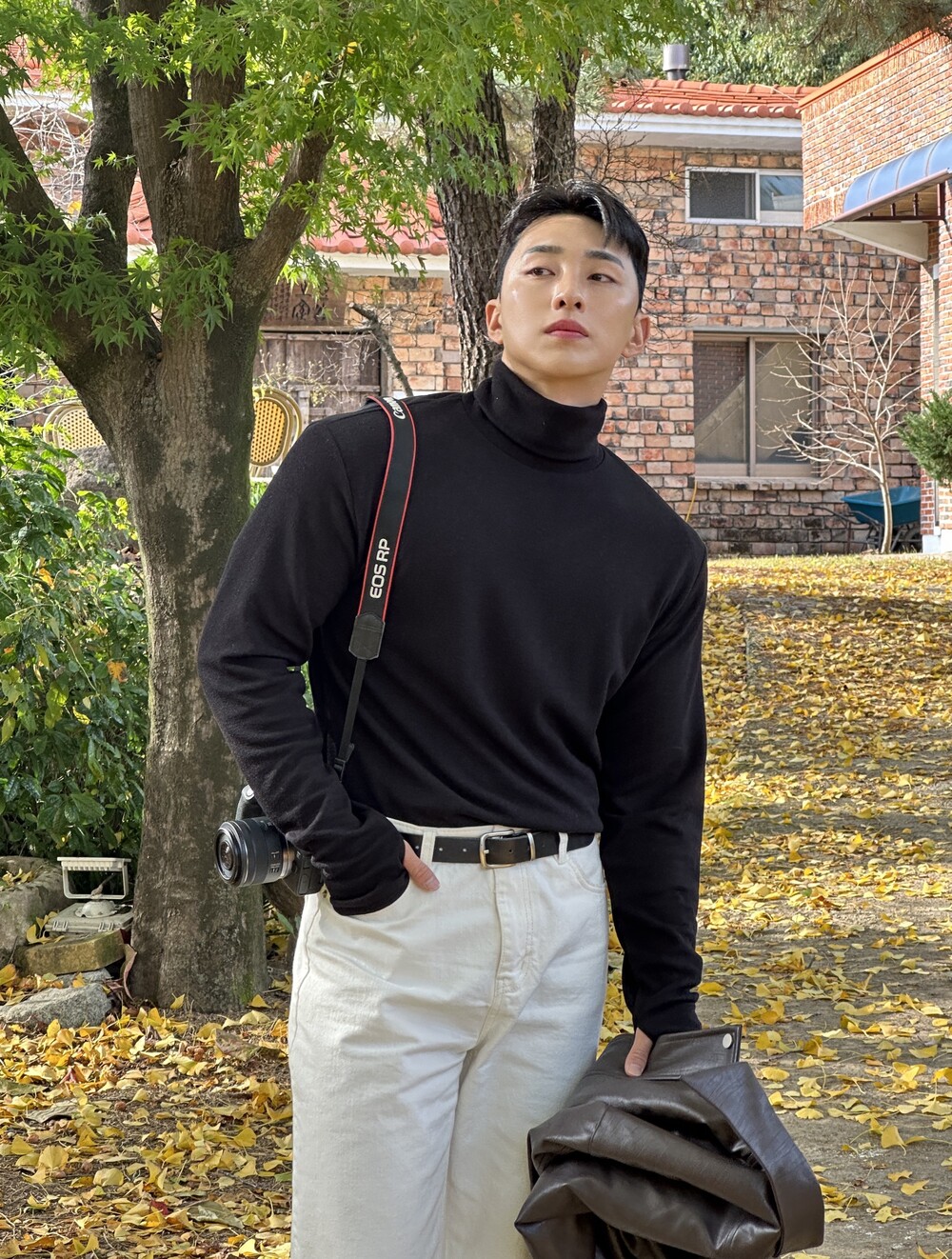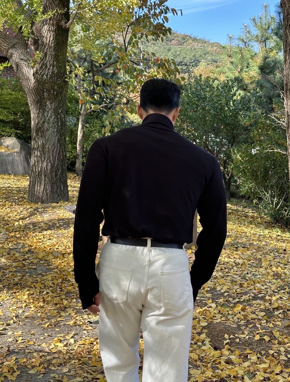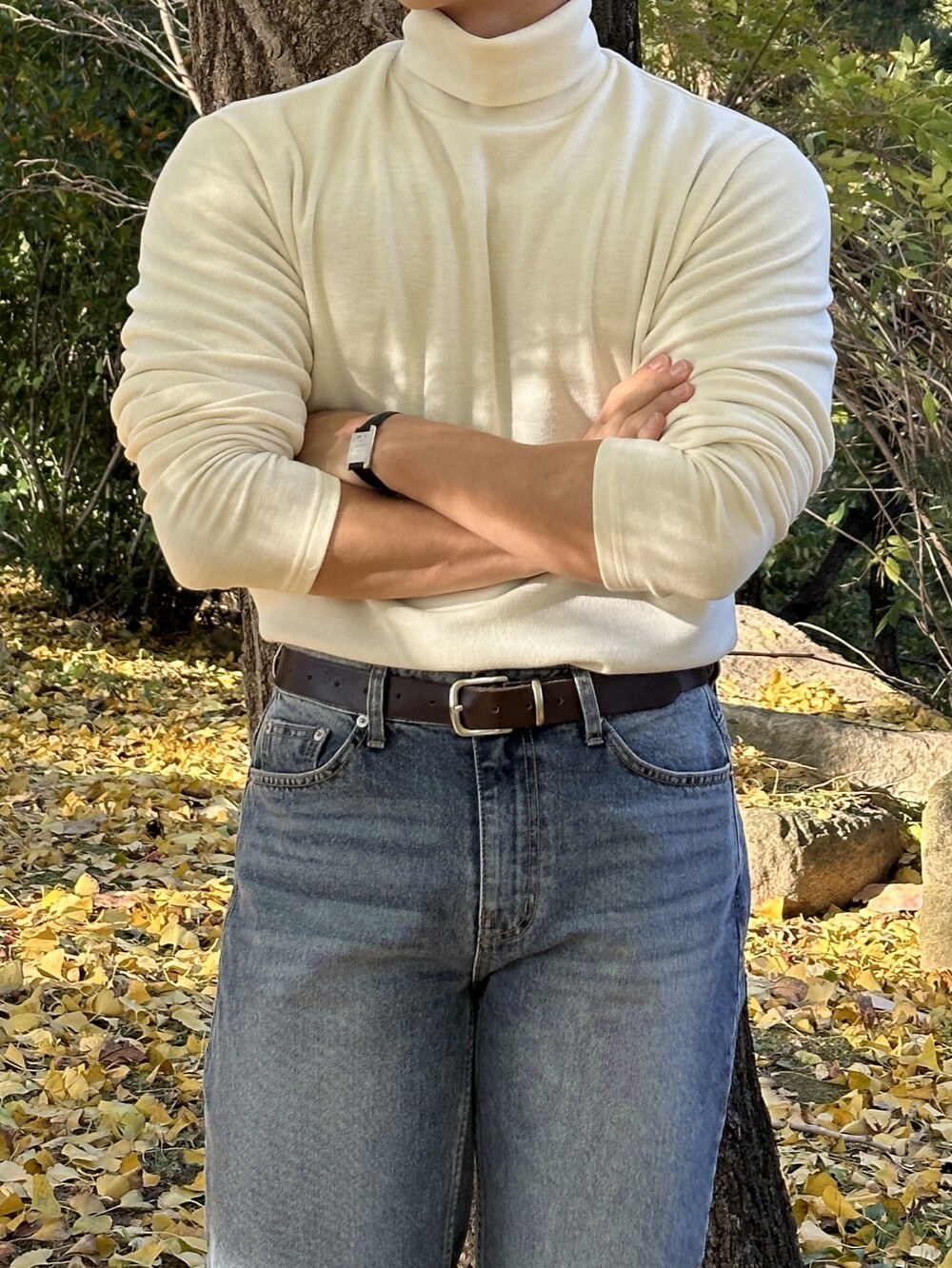 -긴 목폴라로 주름 잡히게 연출하여 캐쥬얼한 무드를, 반으로 접어 연출하여 포멀한 무드를
