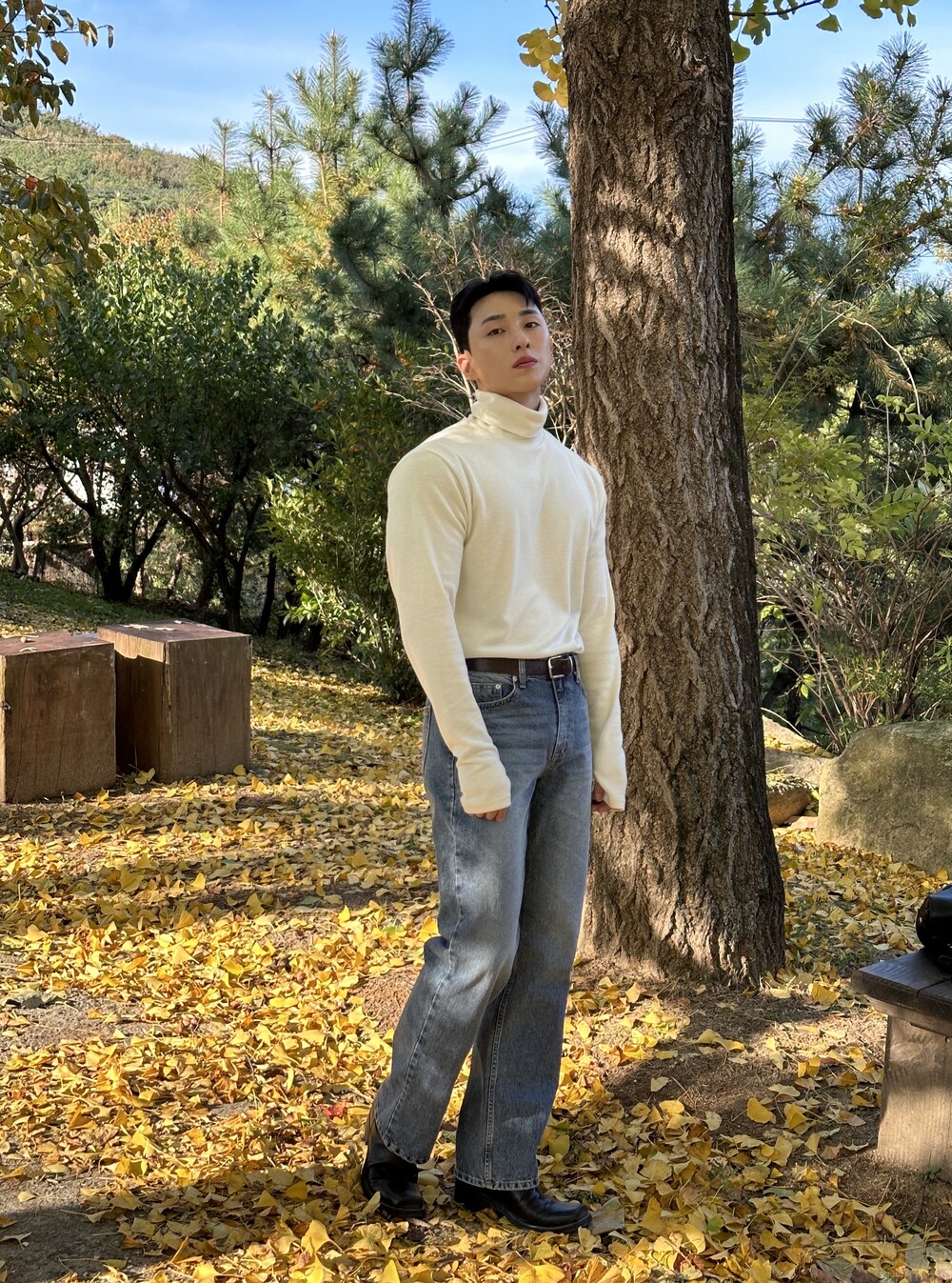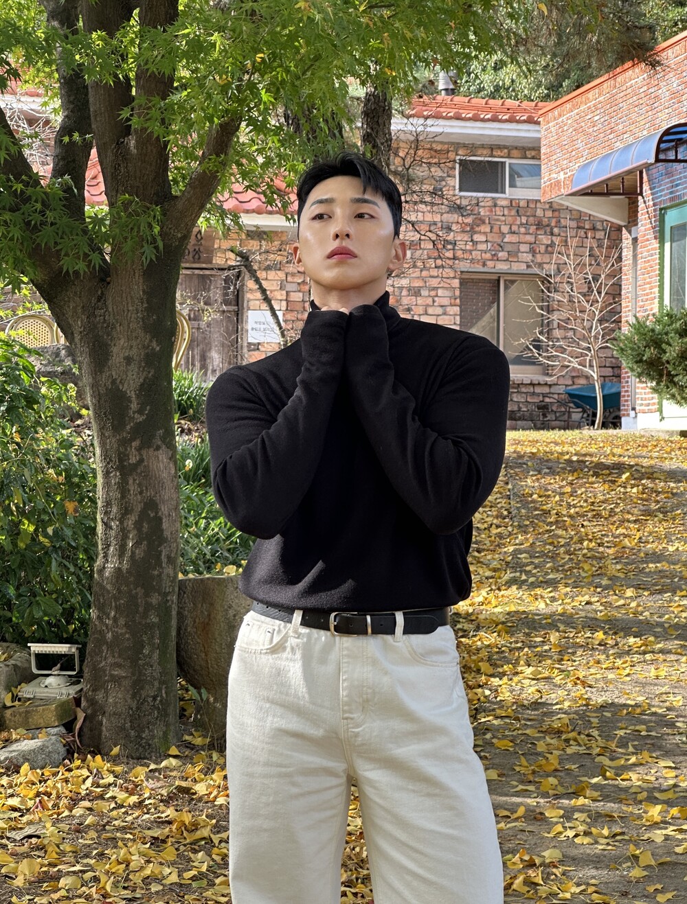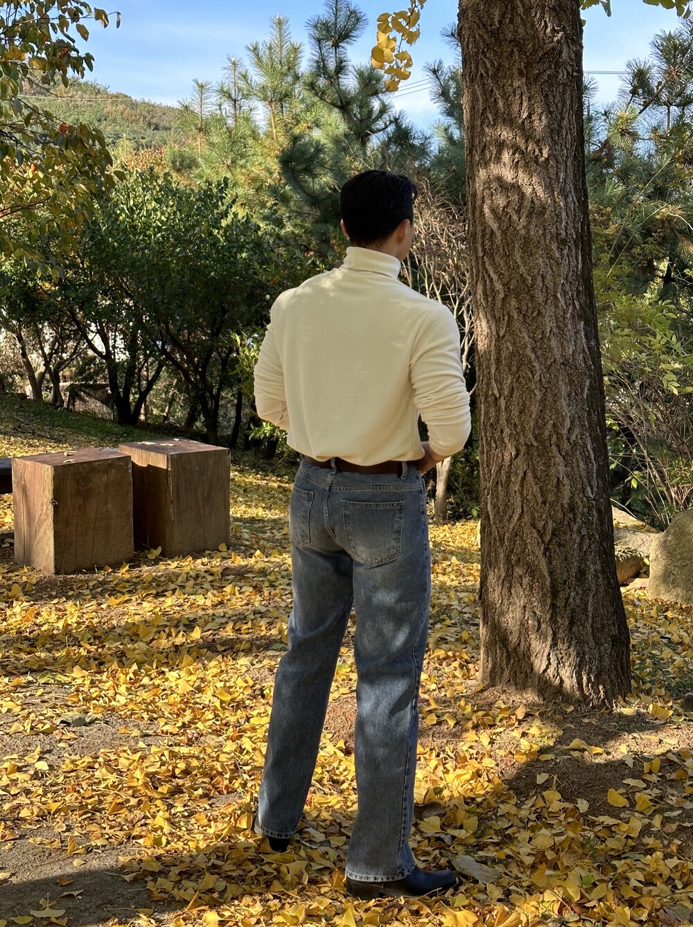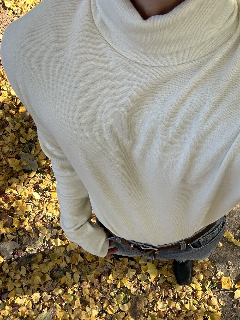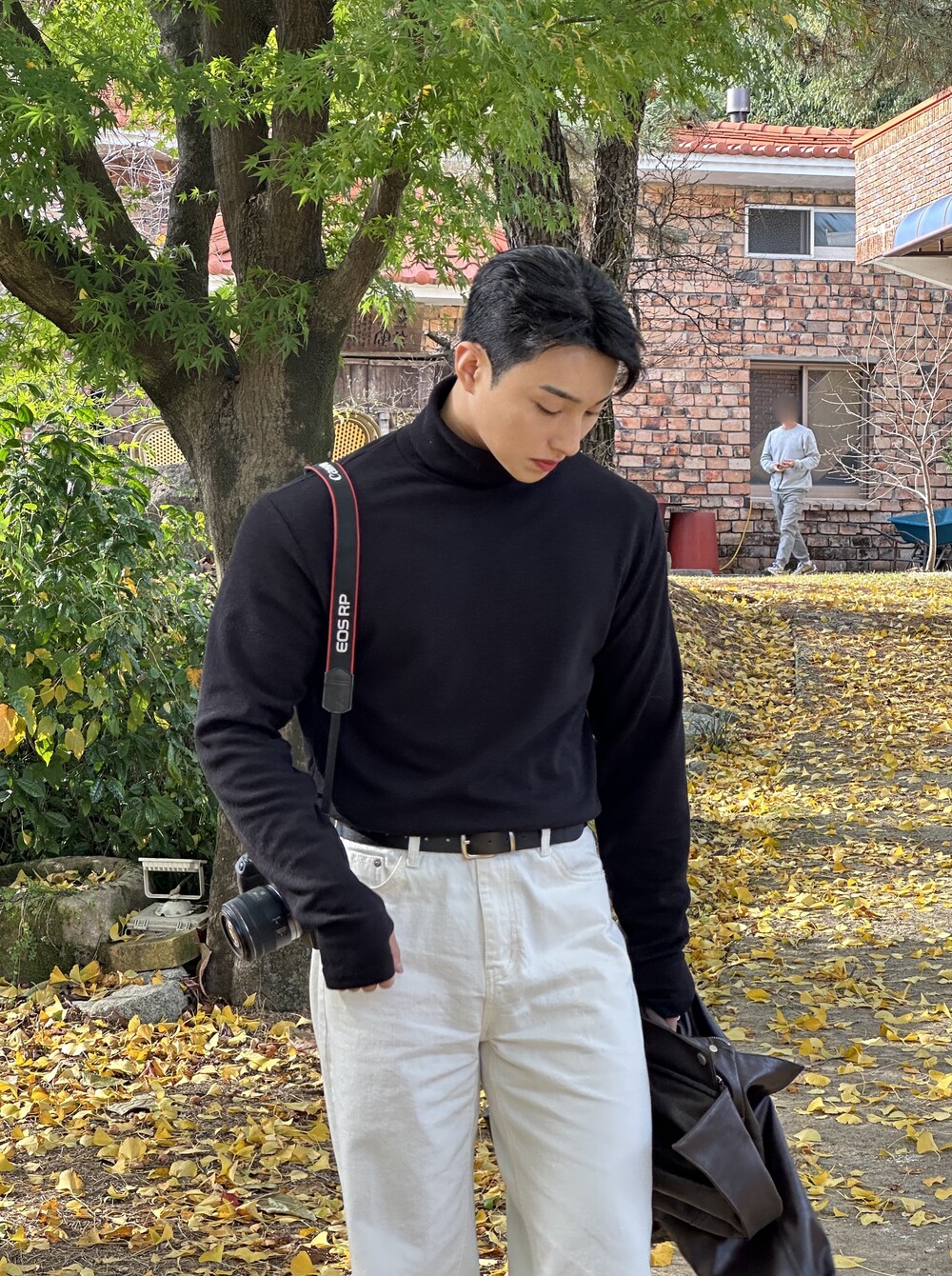 -긴 목폴라로 주름 잡히게 연출하여 캐쥬얼한 무드를, 반으로 접어 연출하여 포멀한 무드를