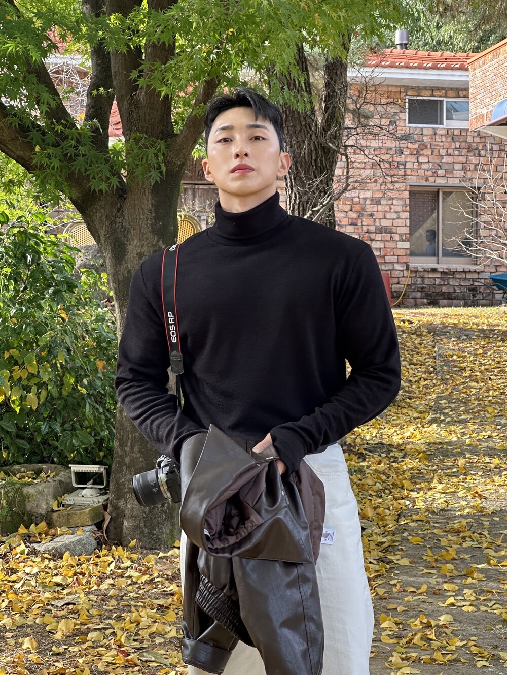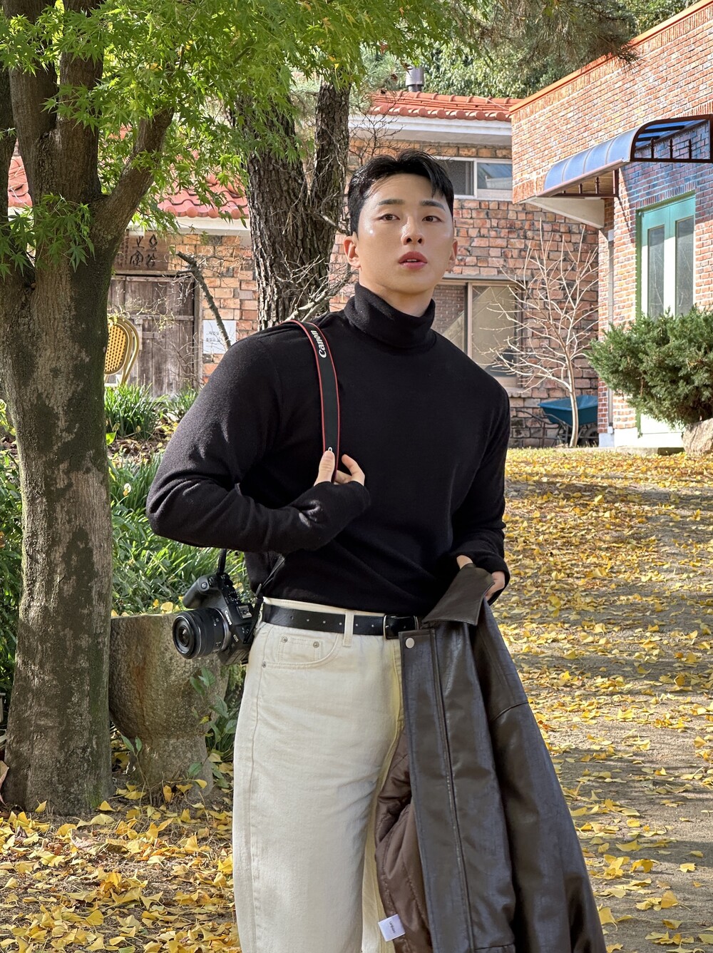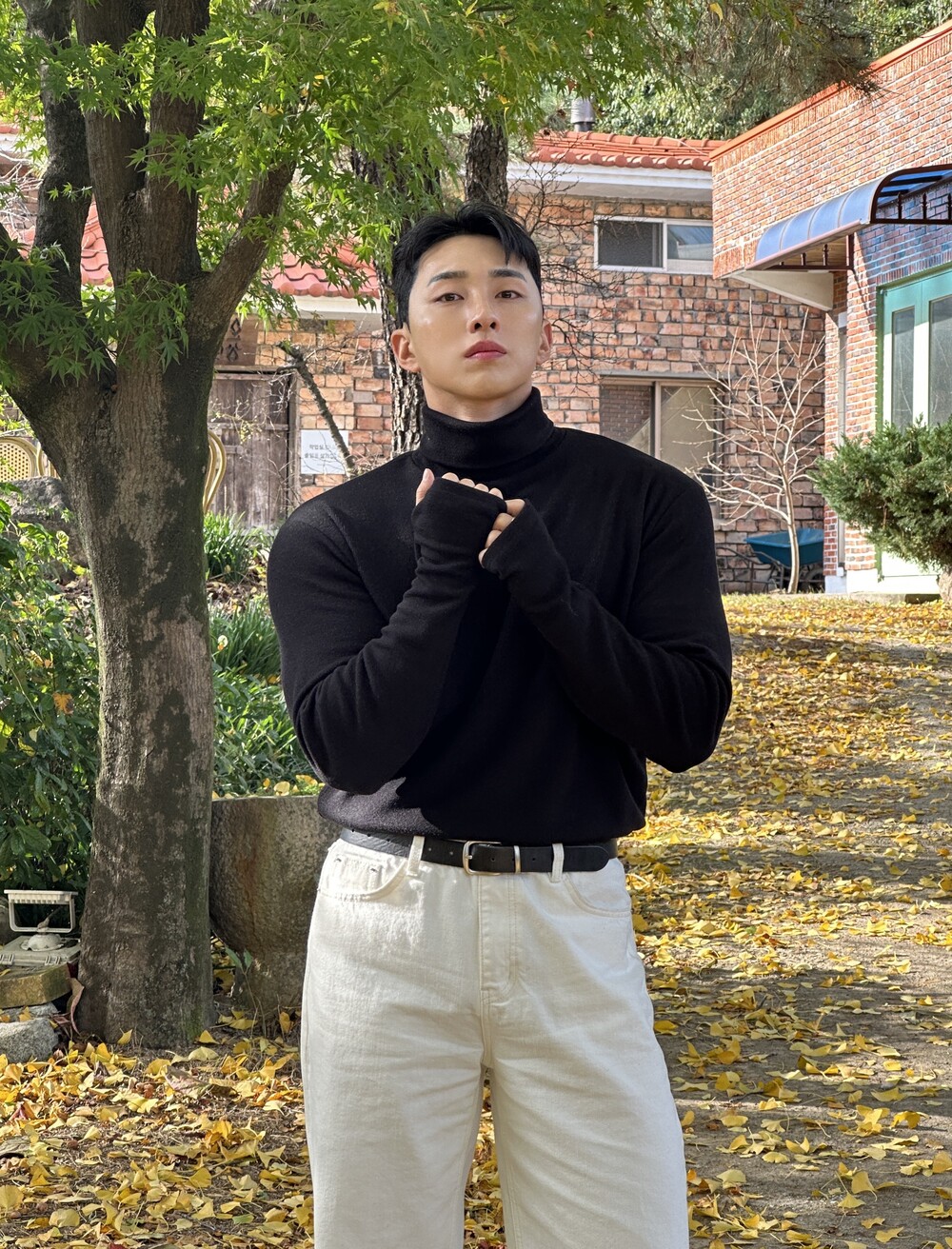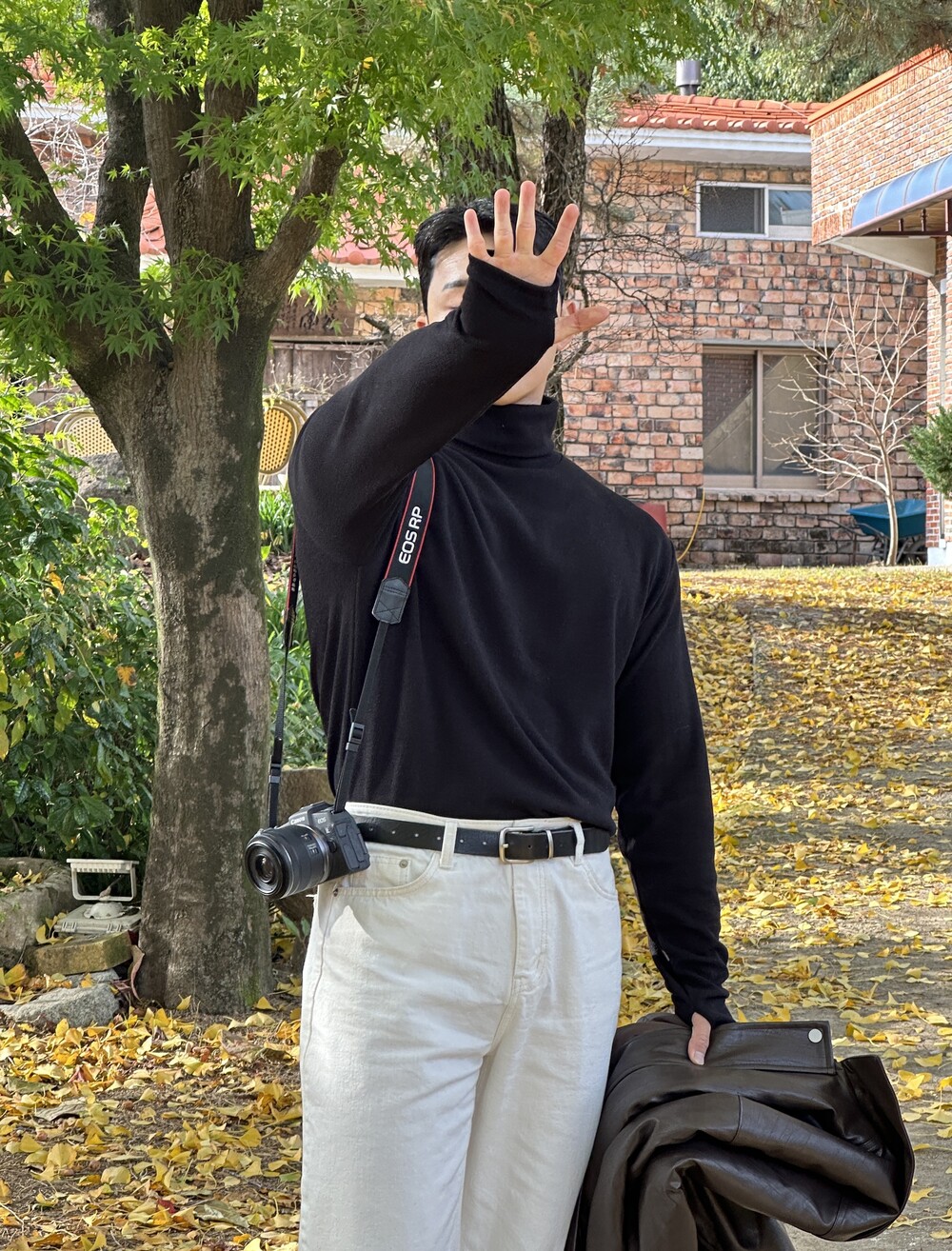 -긴 목폴라로 주름 잡히게 연출하여 캐쥬얼한 무드를, 반으로 접어 연출하여 포멀한 무드를