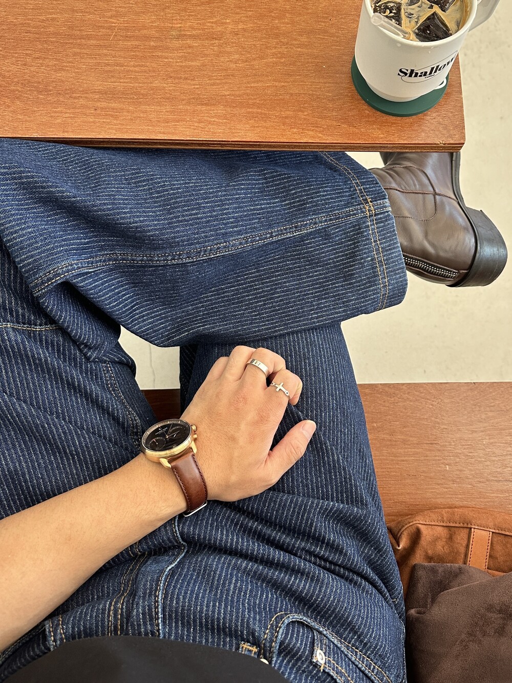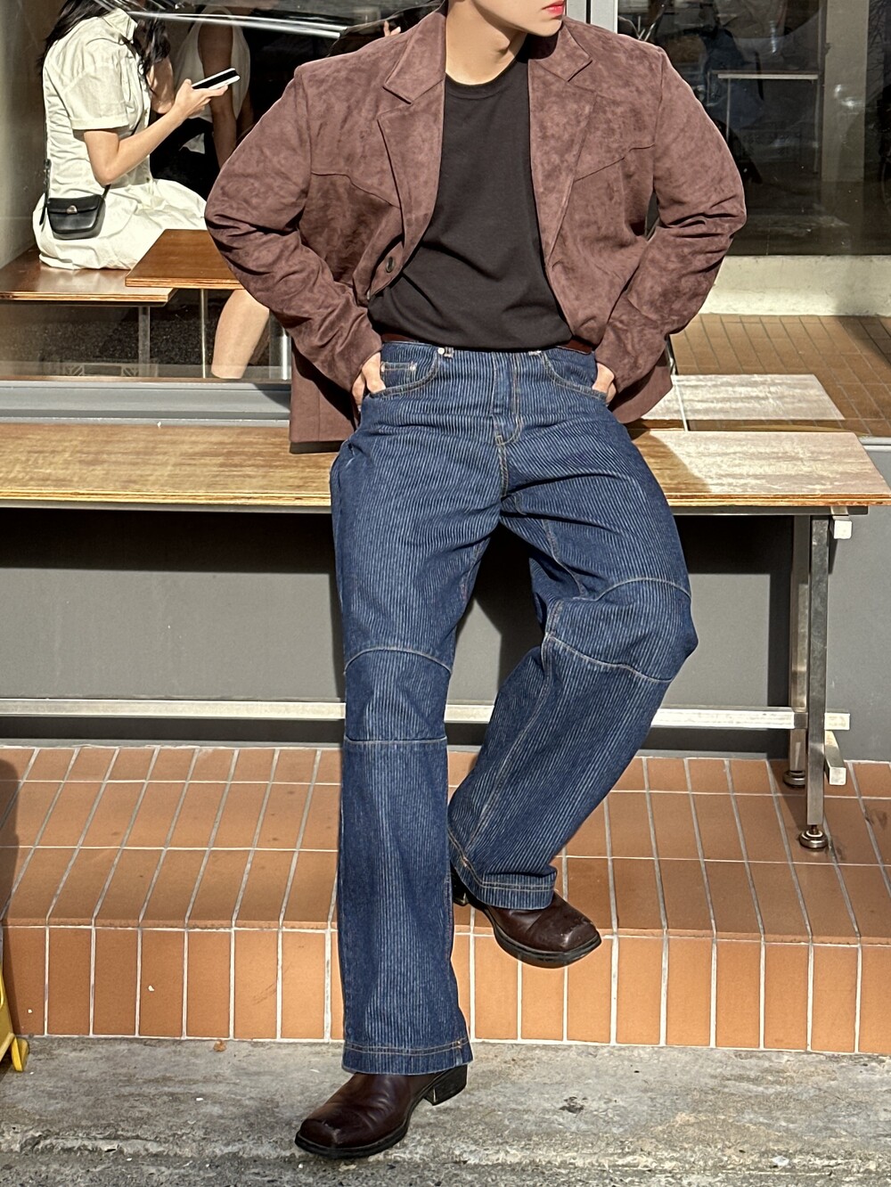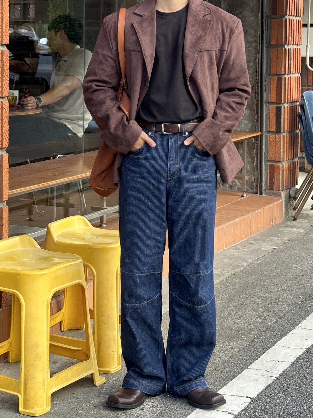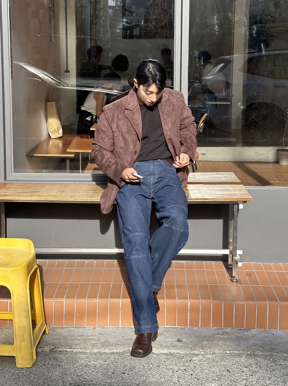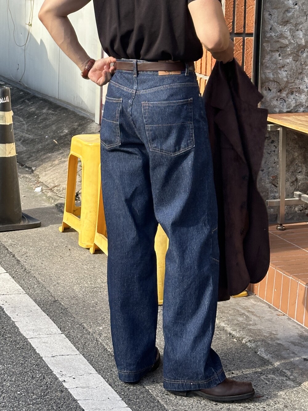 -레트로톤 진청과 진브라운 배색 스티치로 디자인 포인트