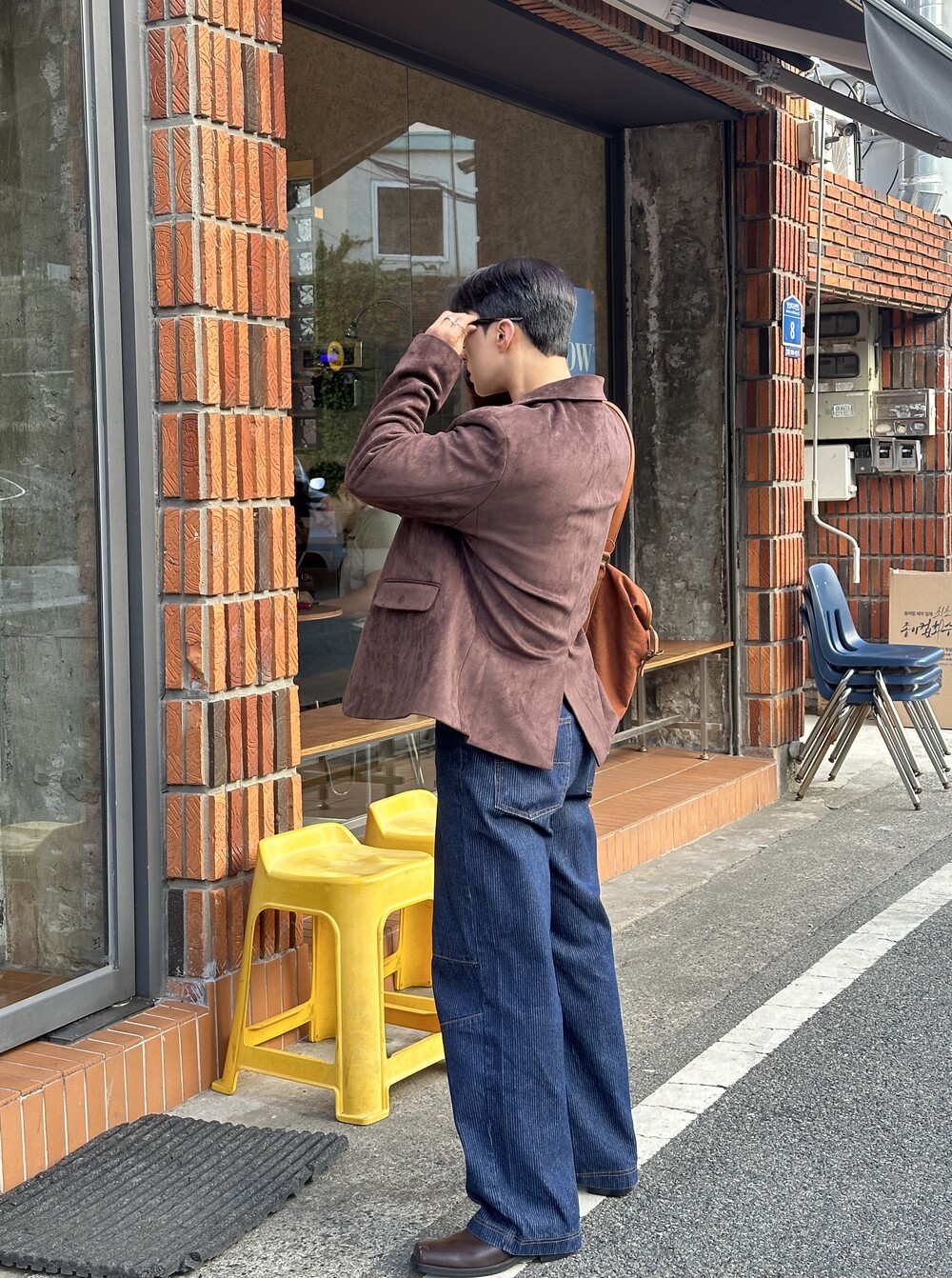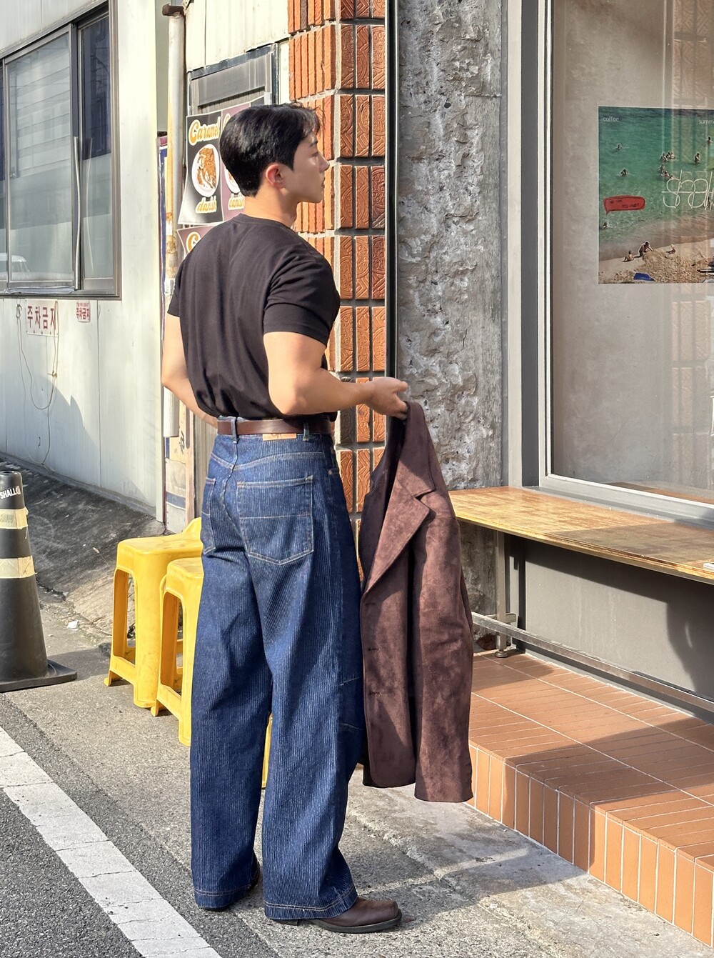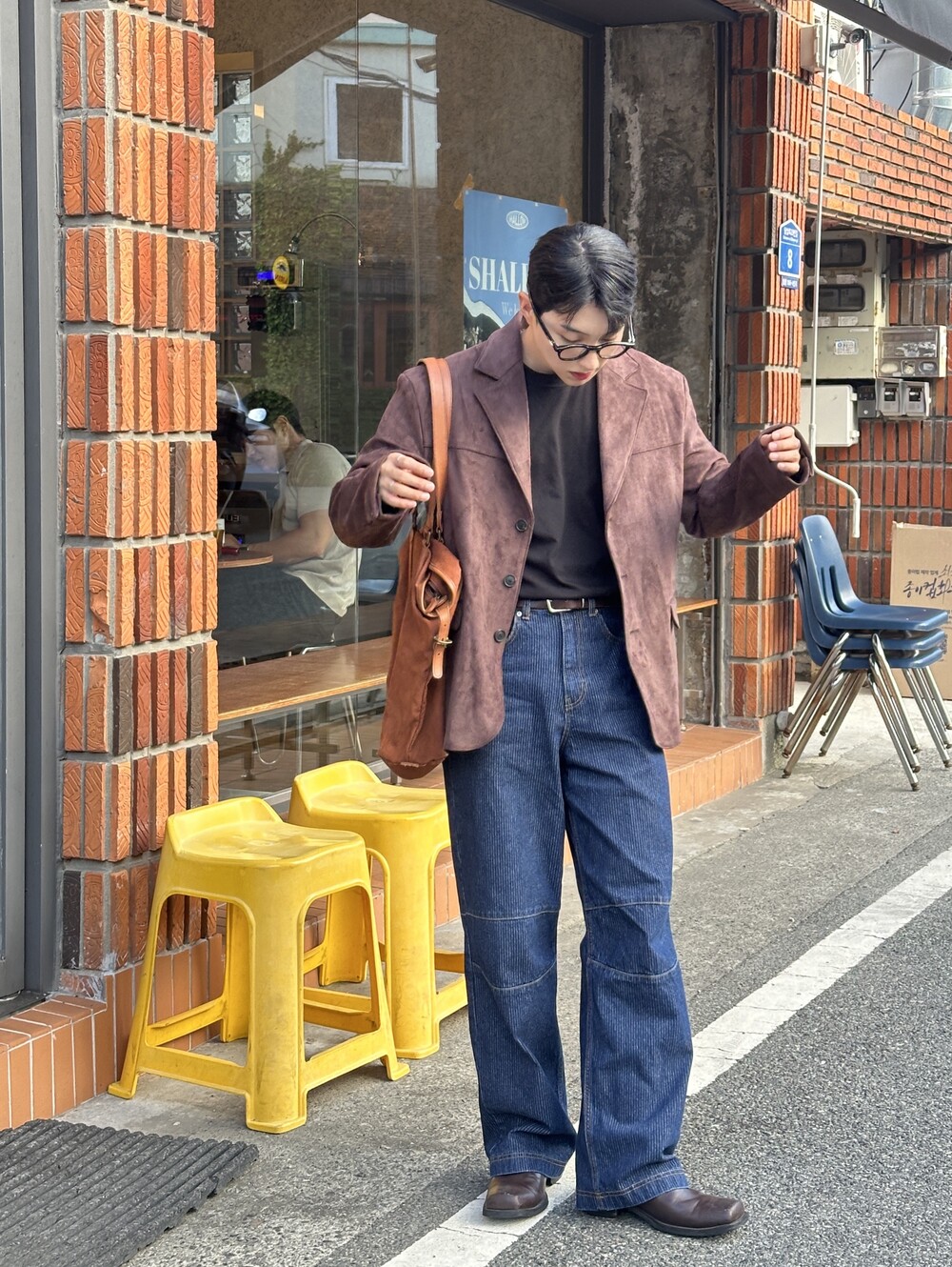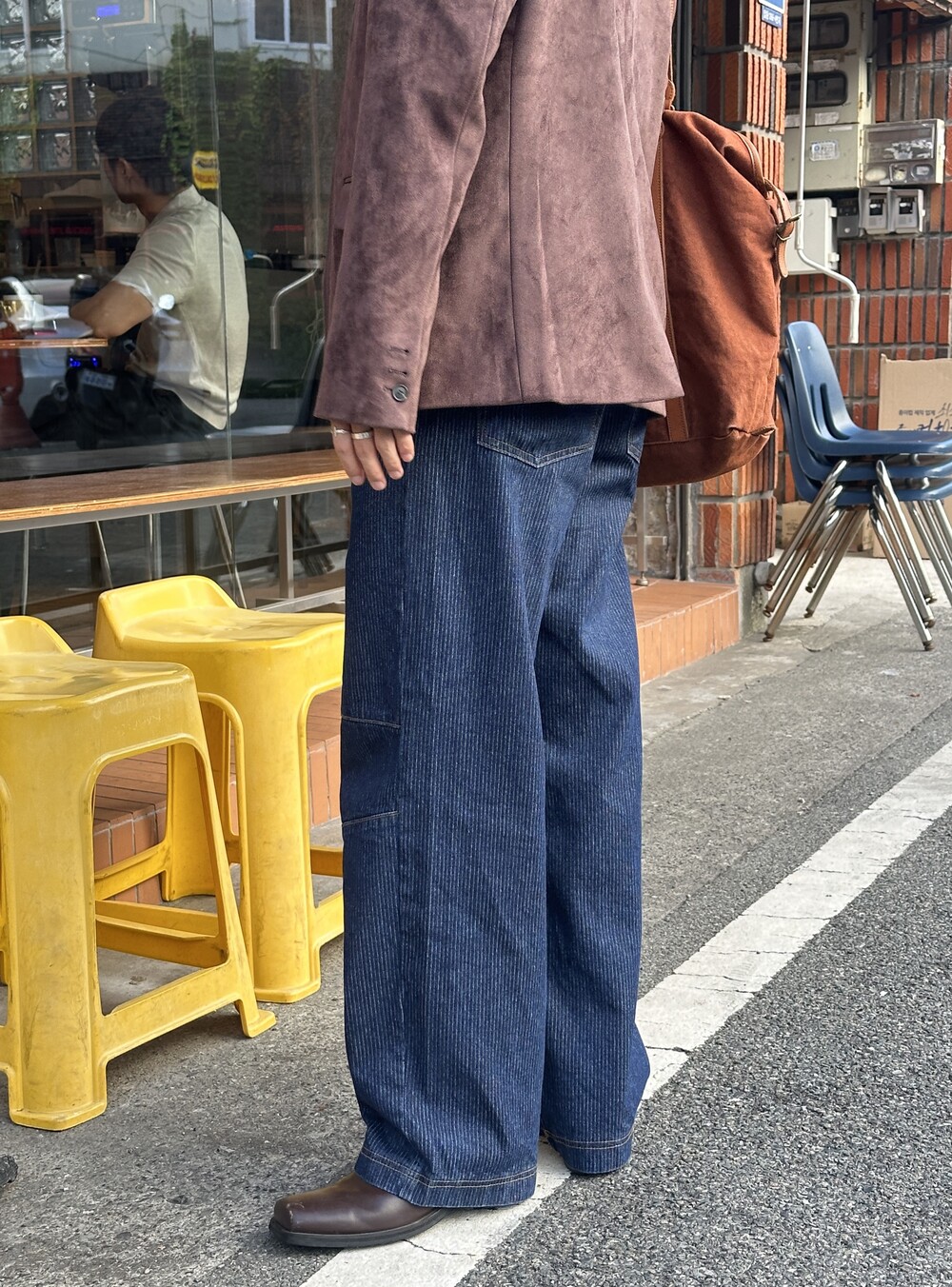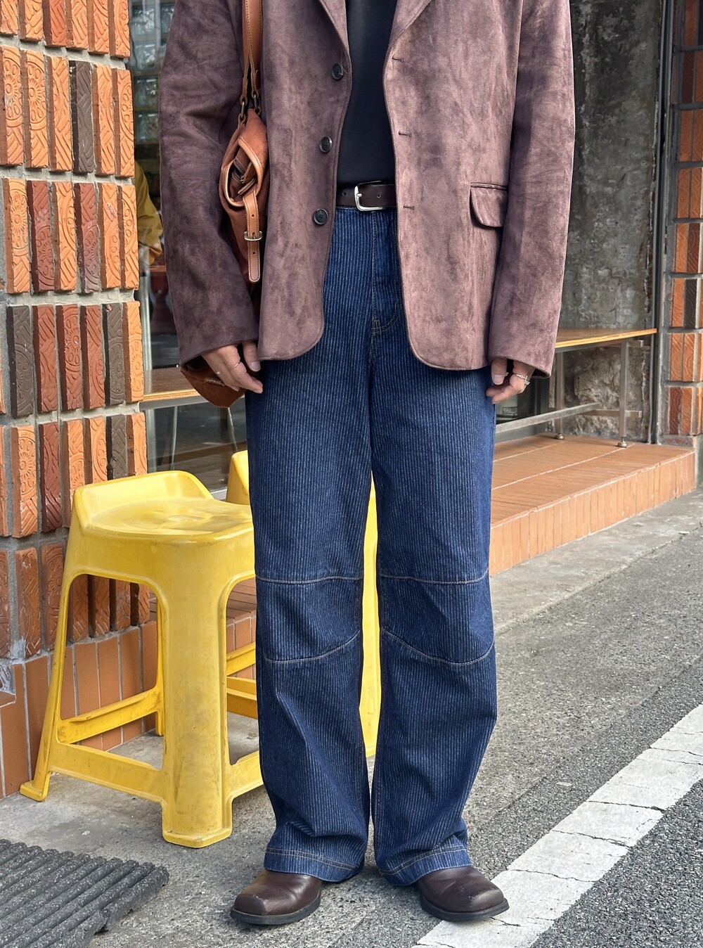 -레트로톤 진청과 진브라운 배색 스티치로 디자인 포인트