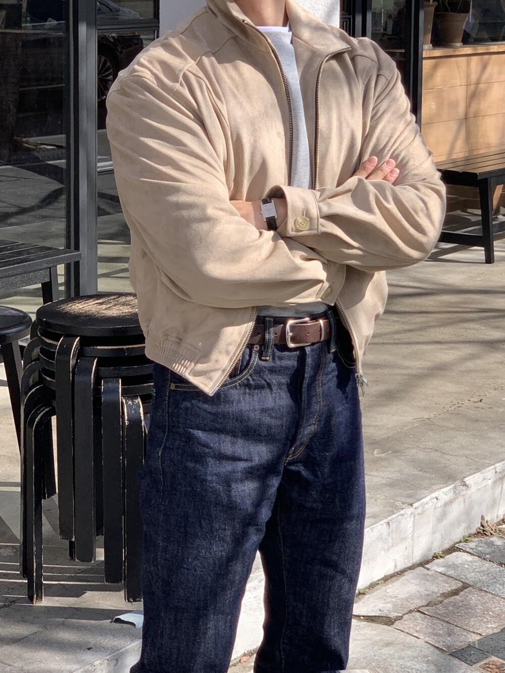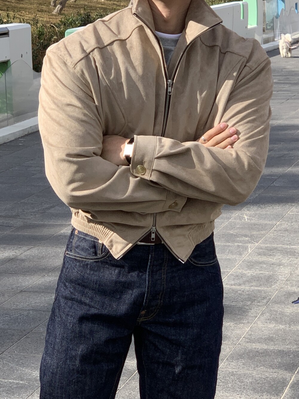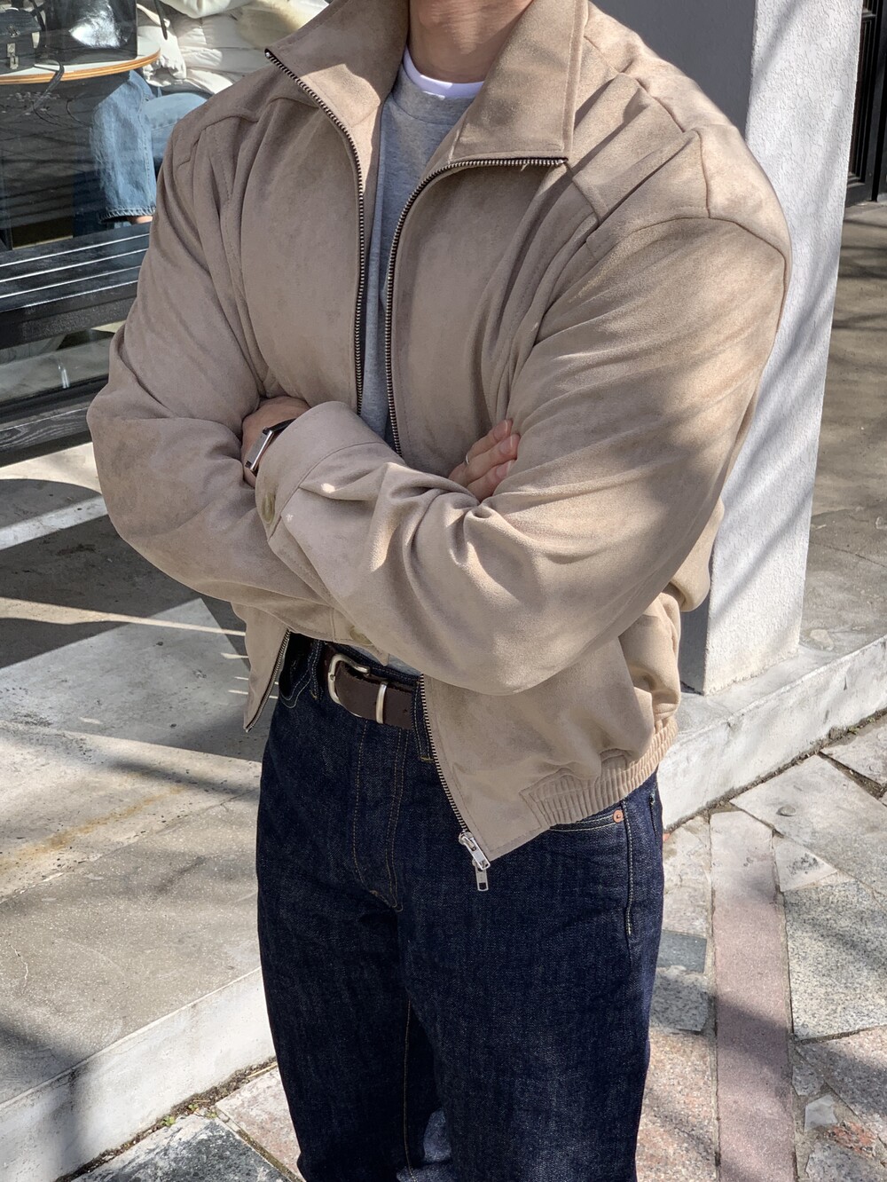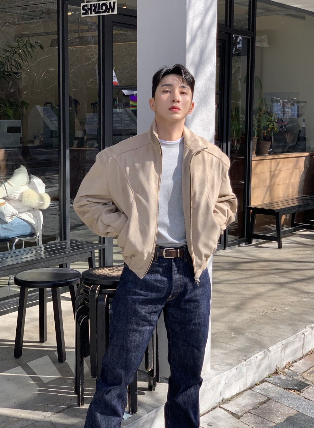 넓은 어깨라인과 크롭한 기장감으로 길어보이는 다리까지