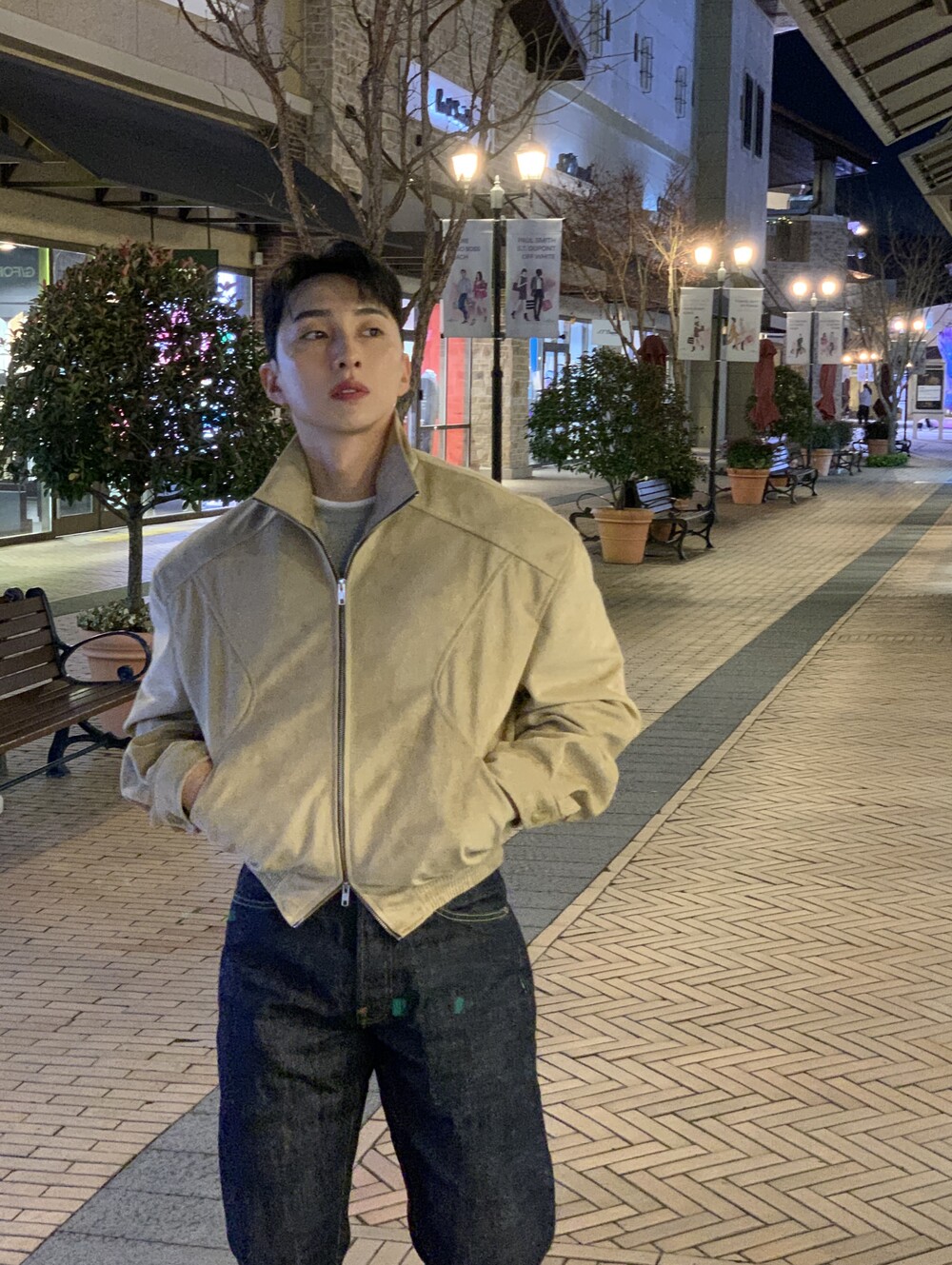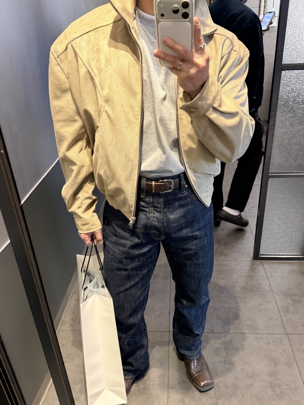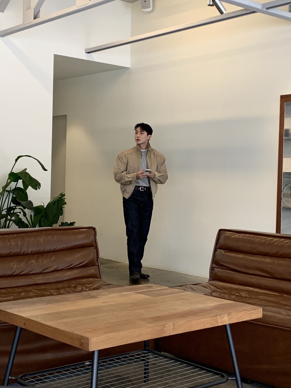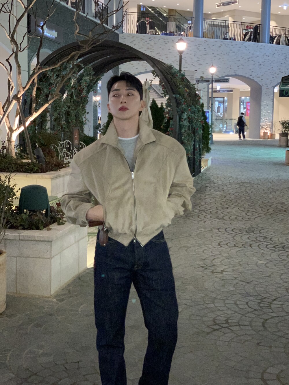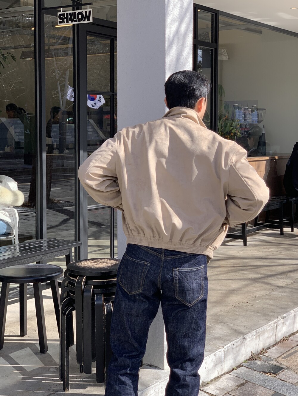 넓은 어깨라인과 크롭한 기장감으로 길어보이는 다리까지