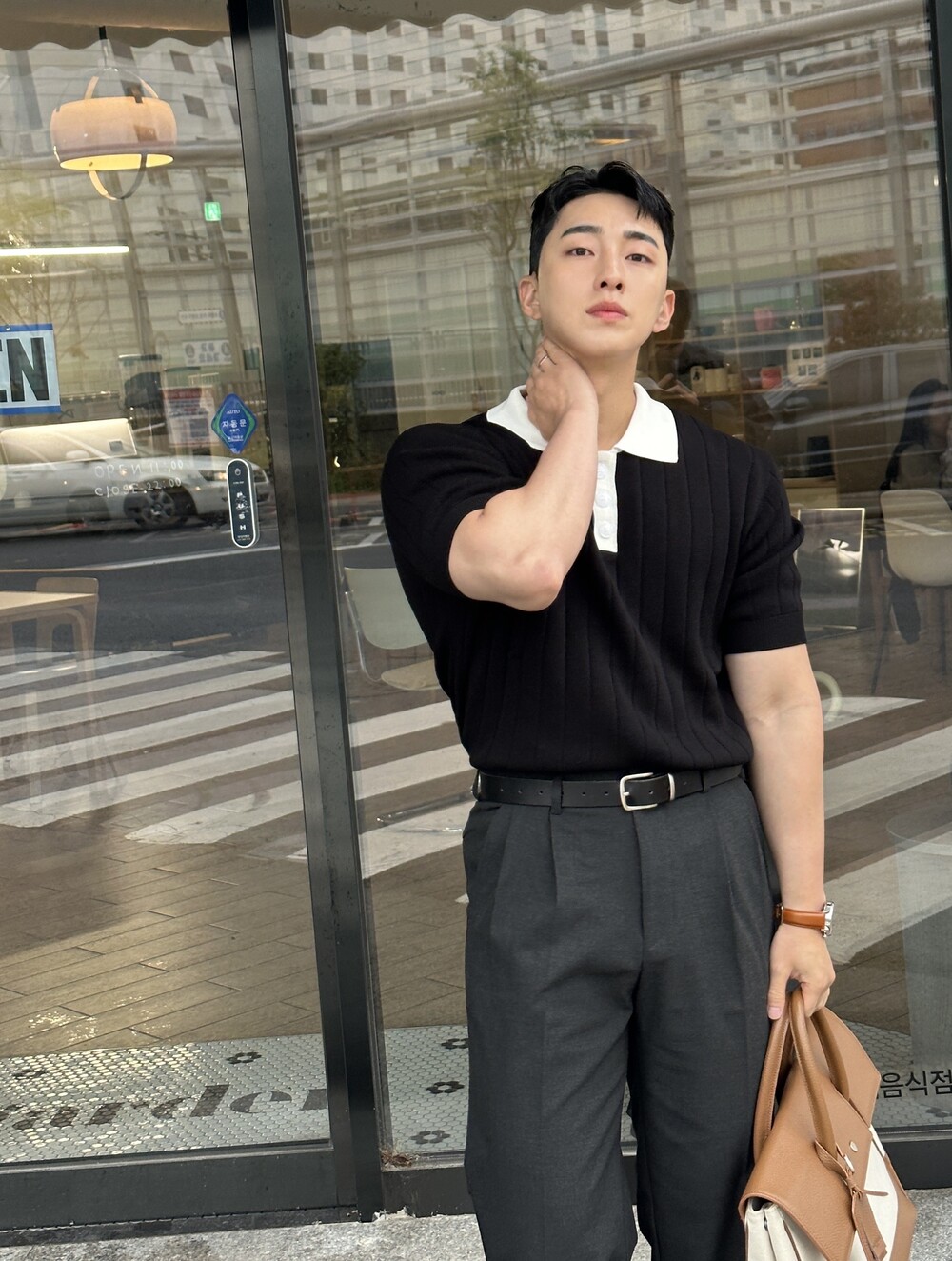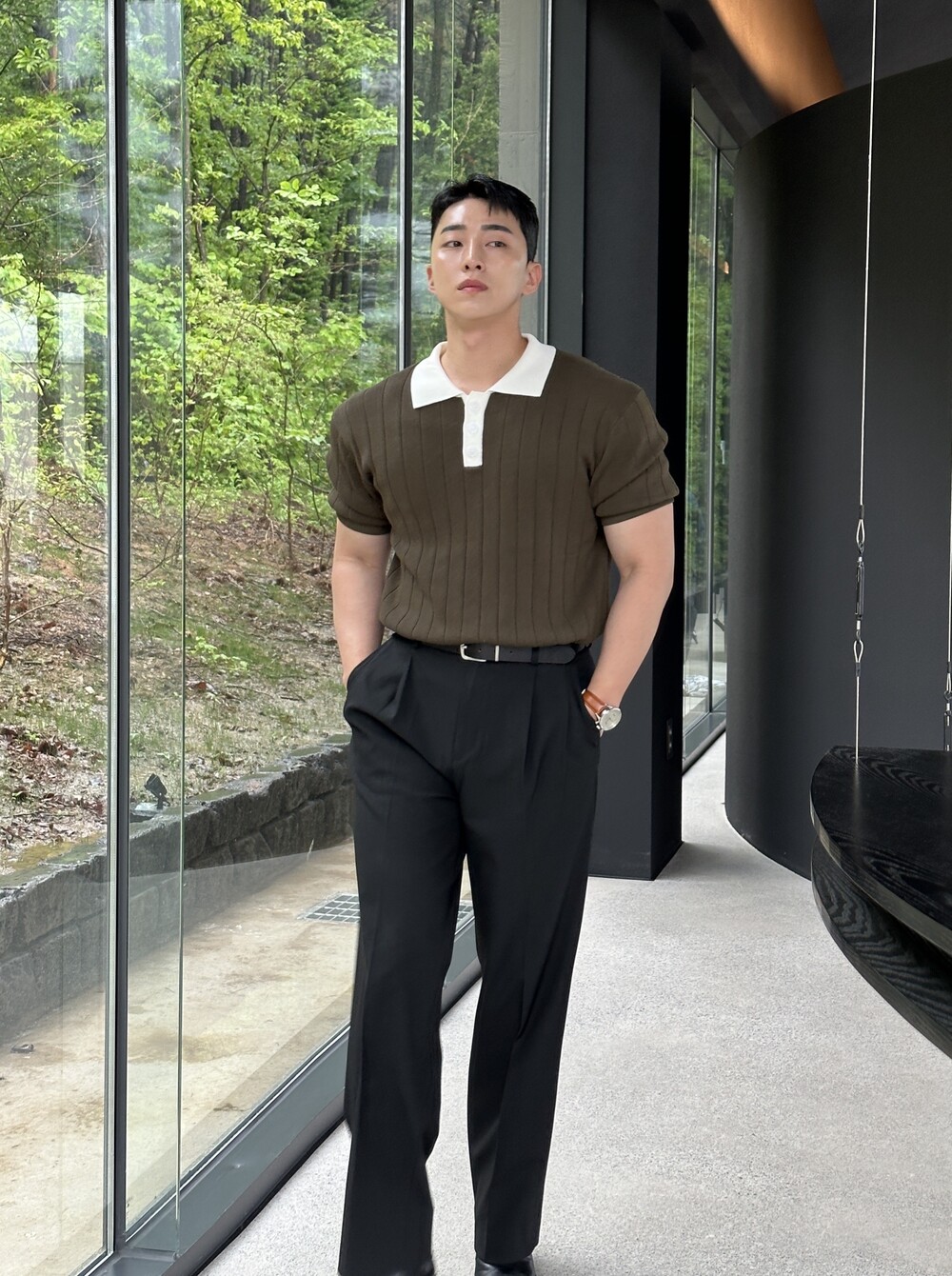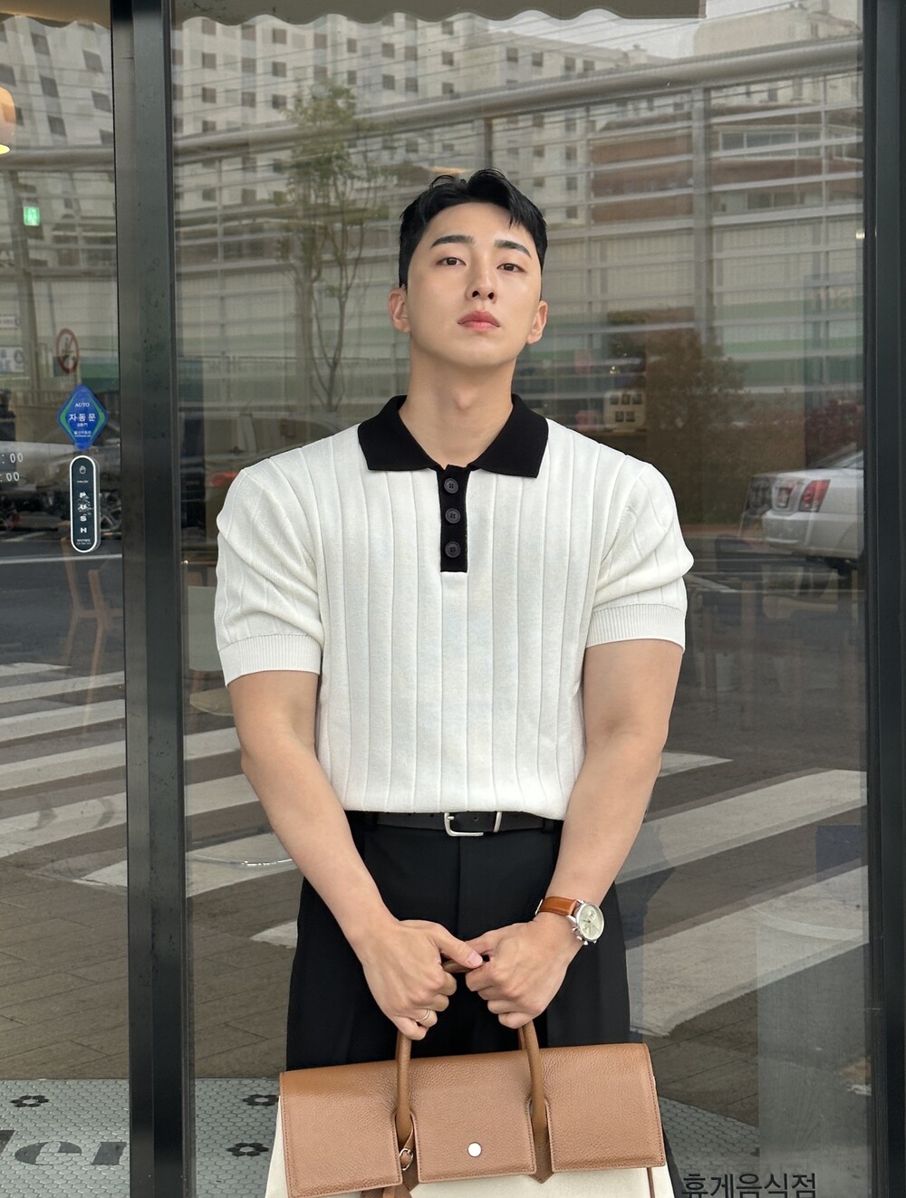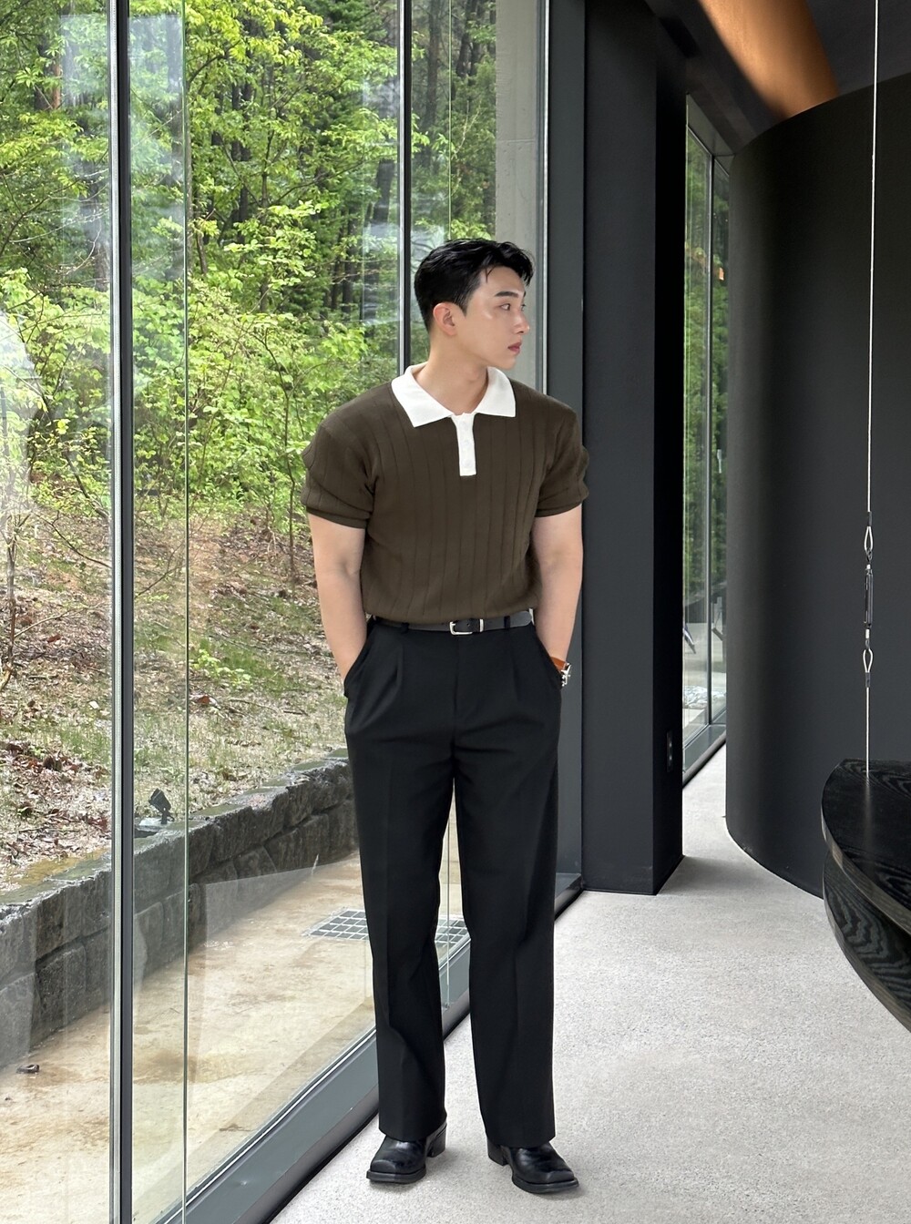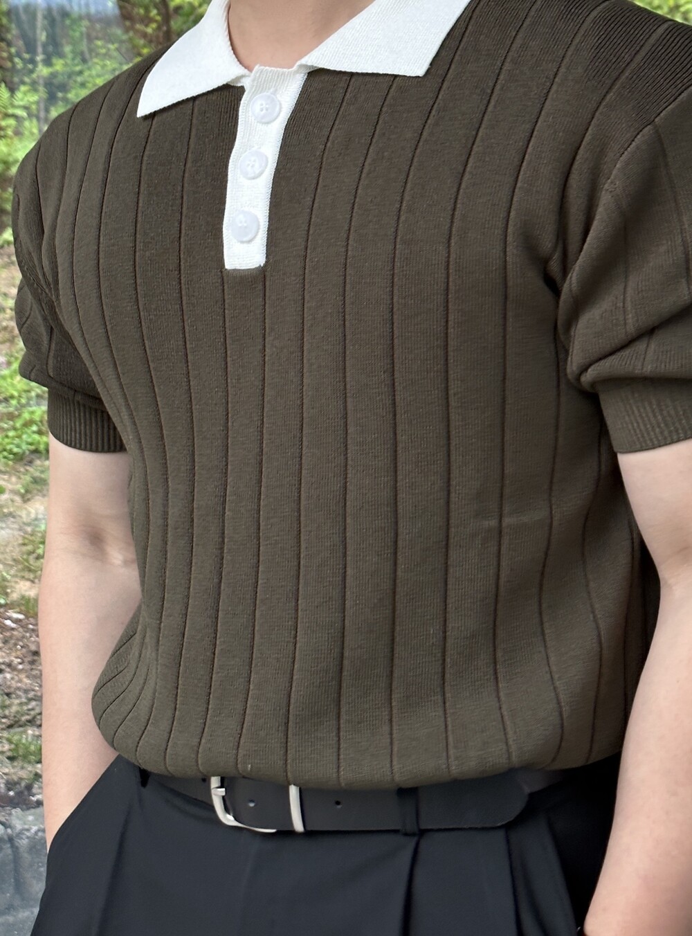 -핏이 이쁘게 떨어지는 세미 머슬핏 반팔 니트