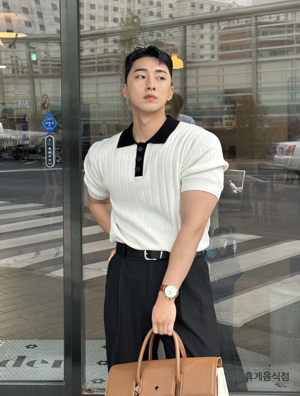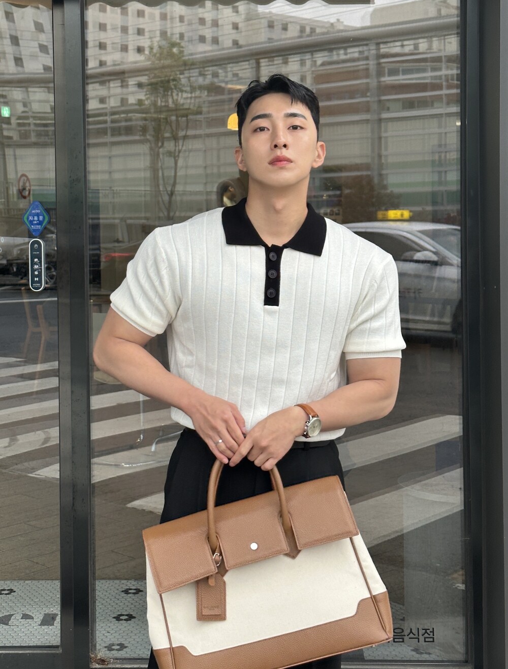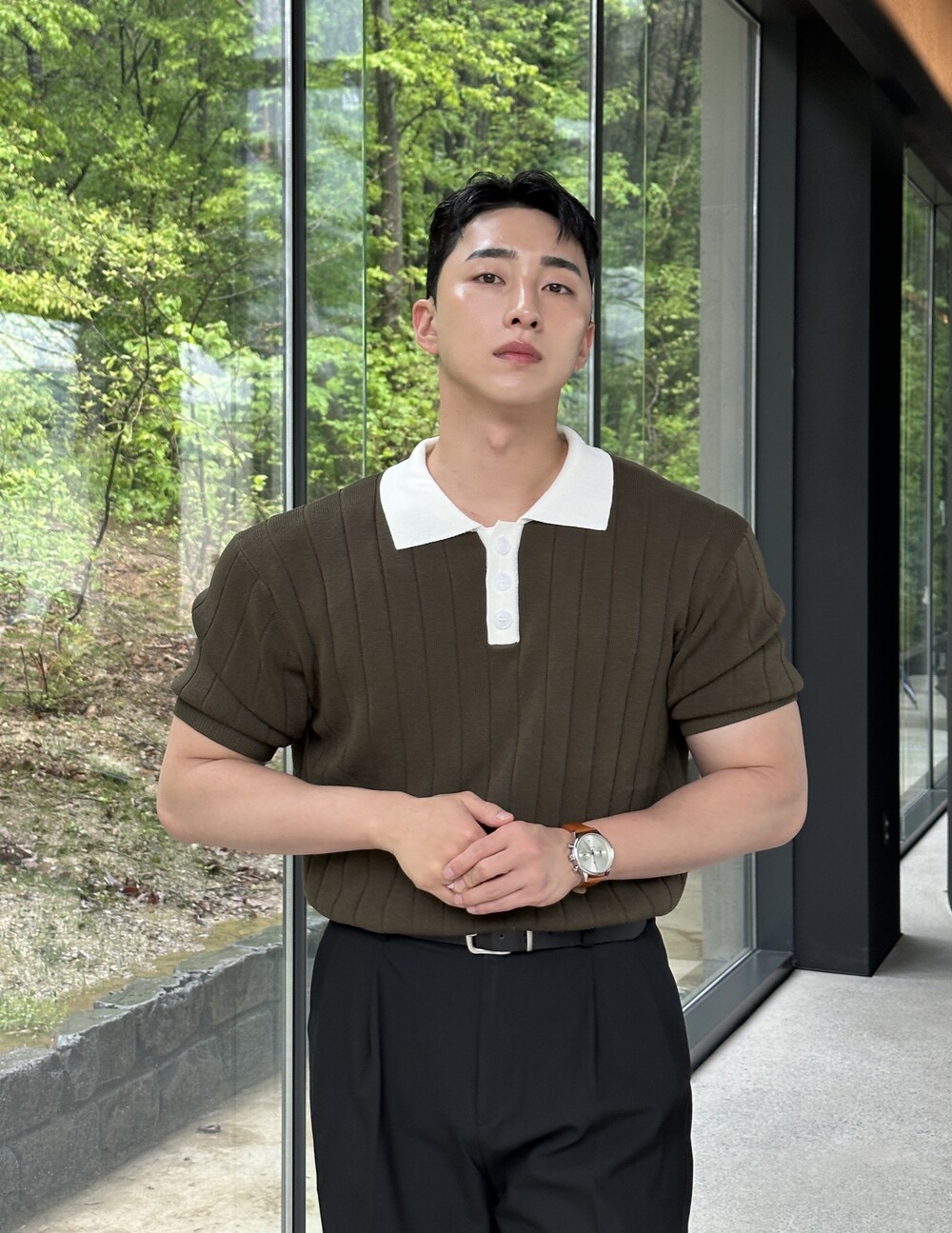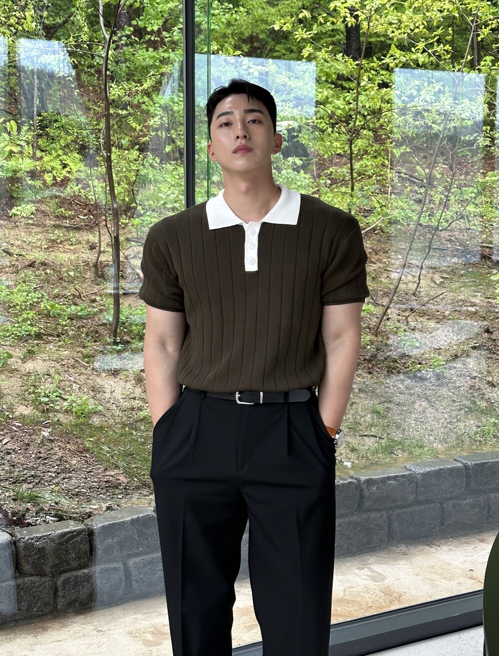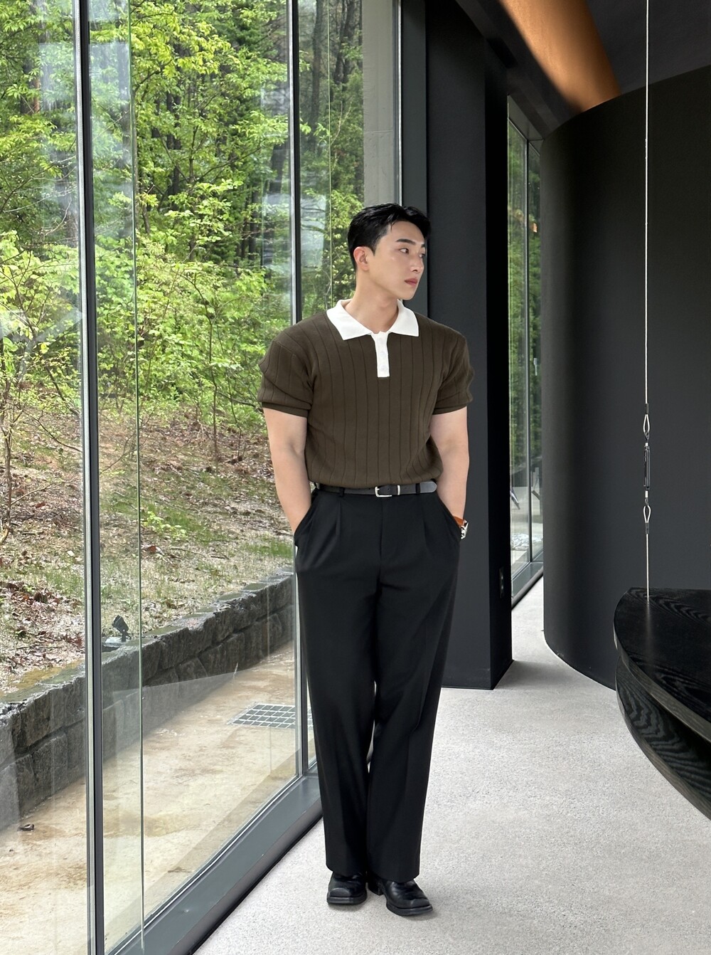-핏이 이쁘게 떨어지는 세미 머슬핏 반팔 니트