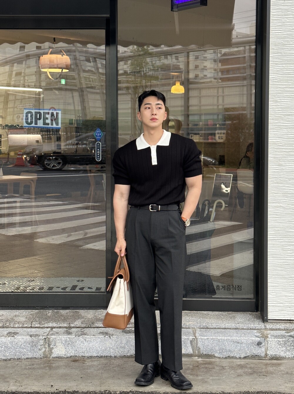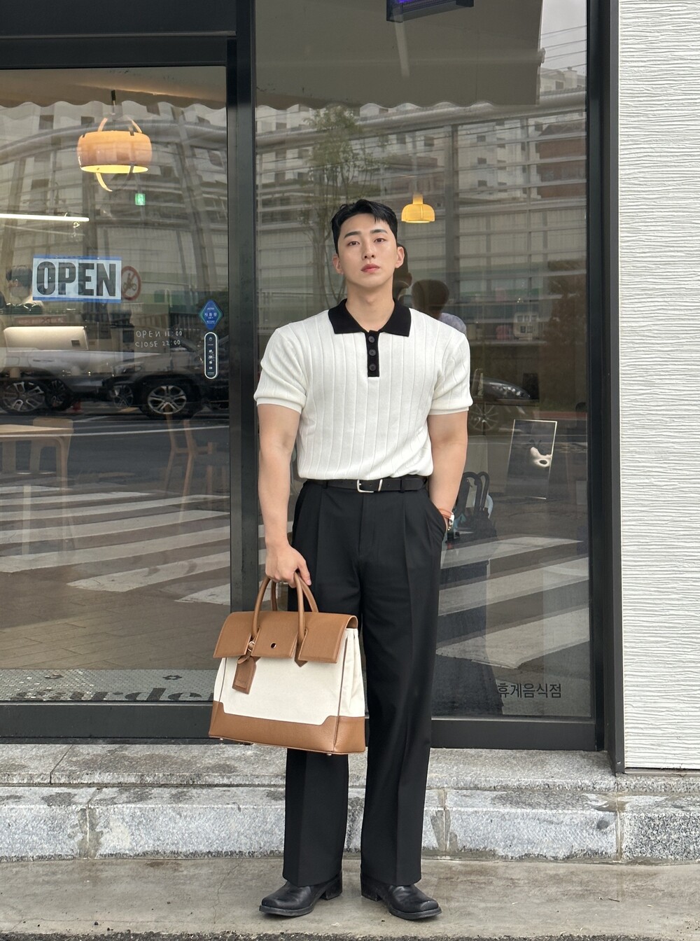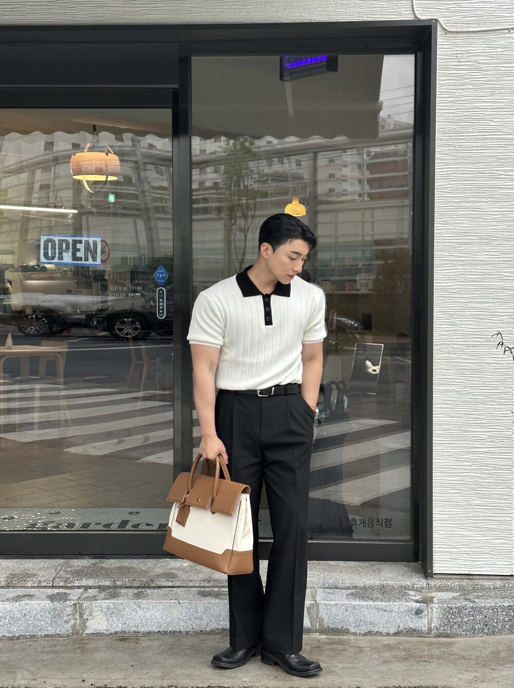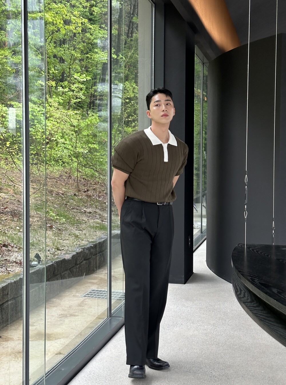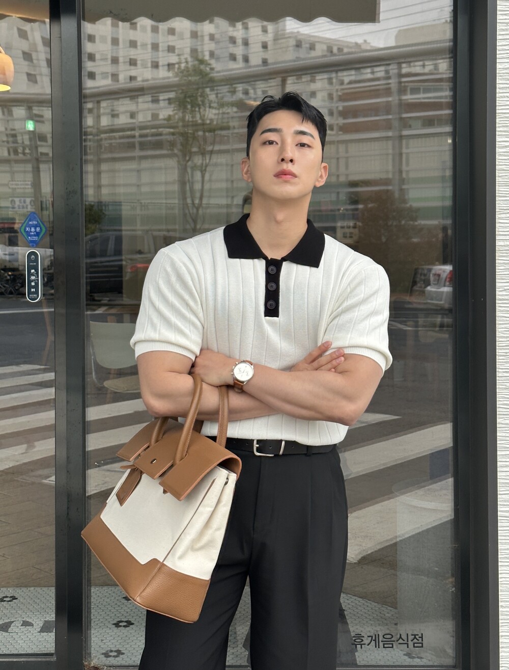 -핏이 이쁘게 떨어지는 세미 머슬핏 반팔 니트