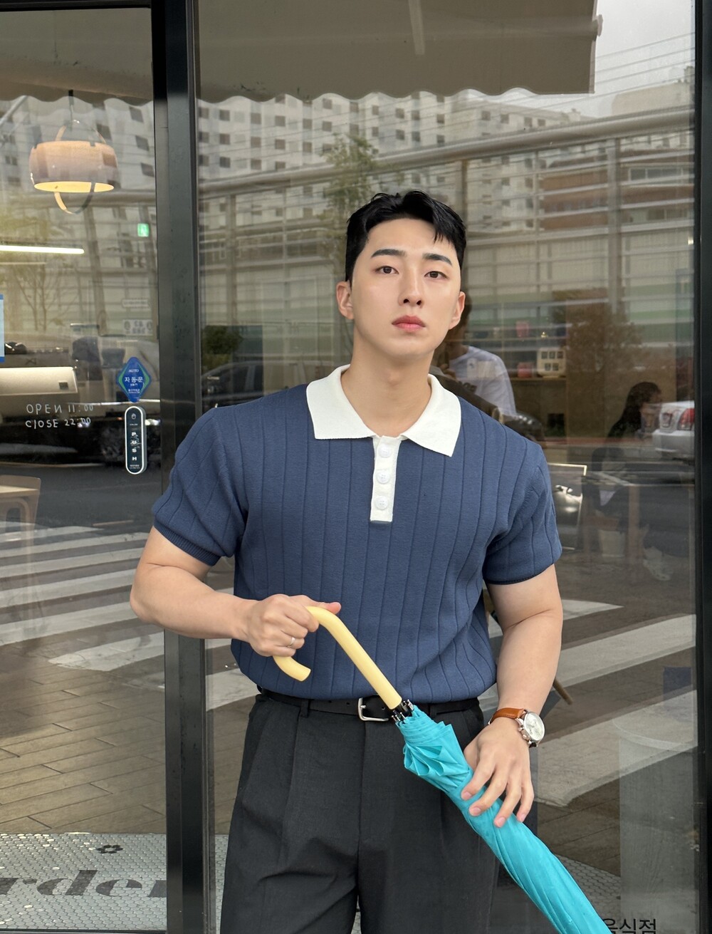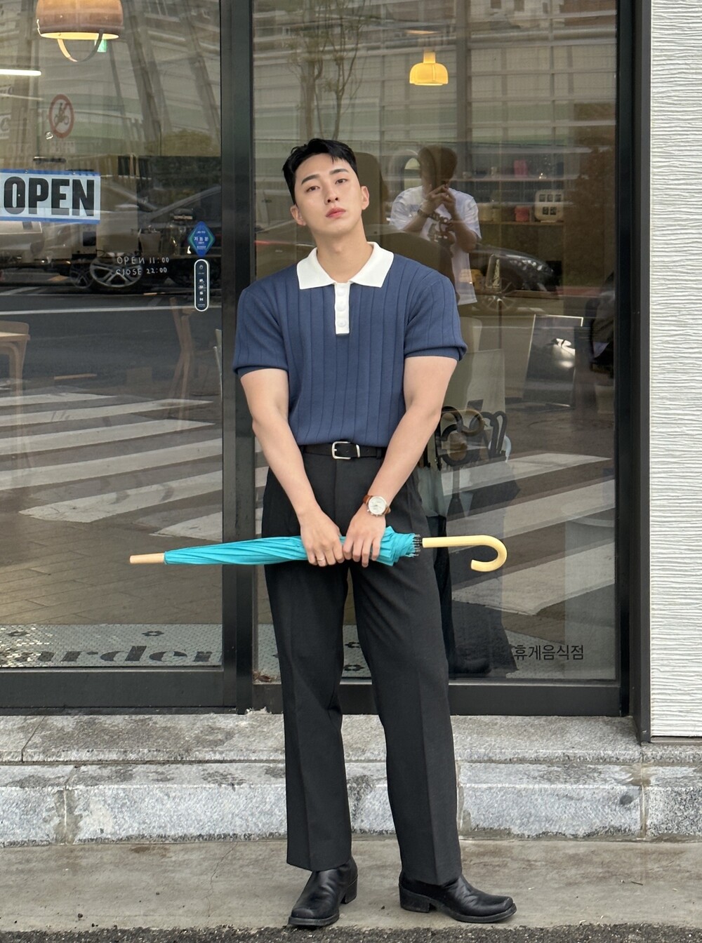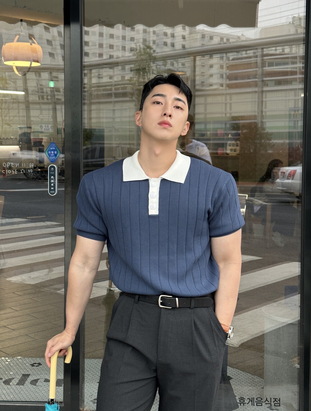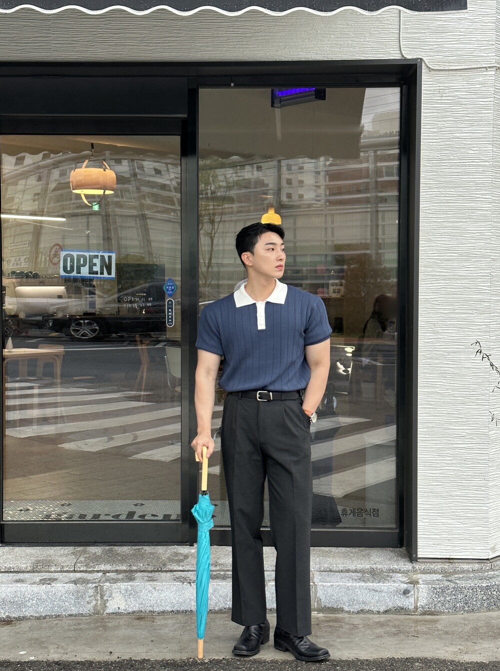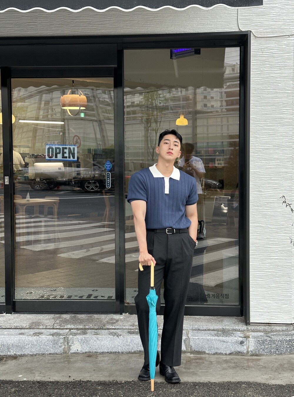-넓게 뺀 어깨 핏으로 넓은 어깨 연출 가능