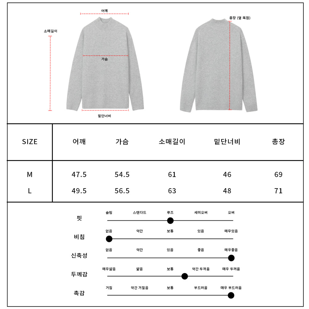 L - 어깨 49.5cm / 가슴 56.5cm / 소매 63cm / 총장 71cm