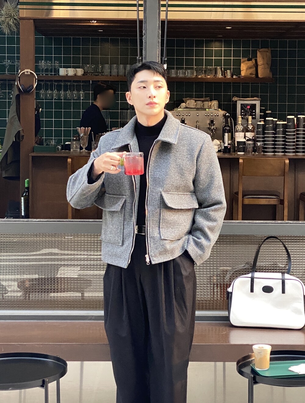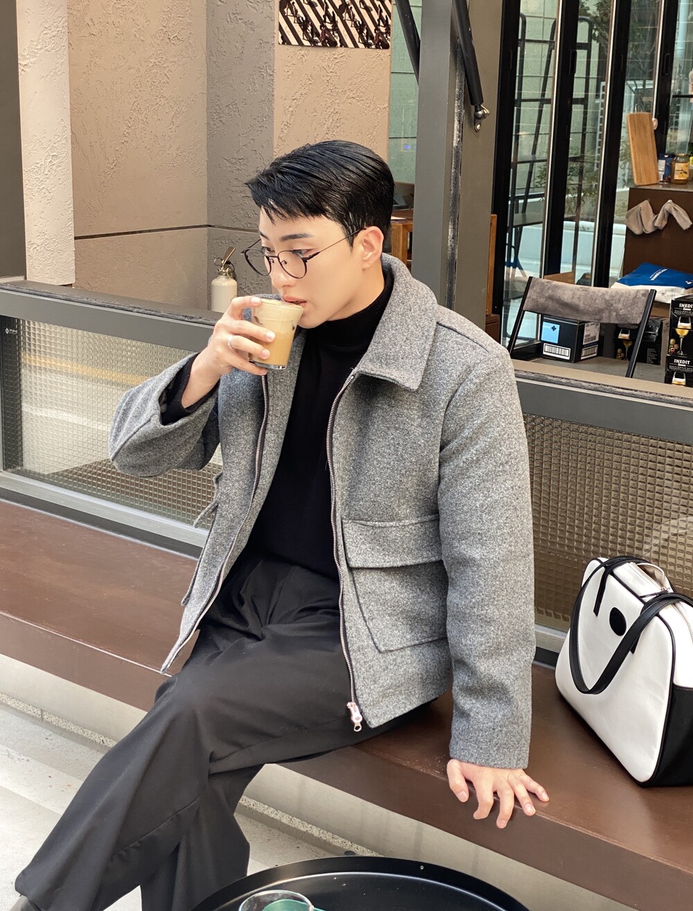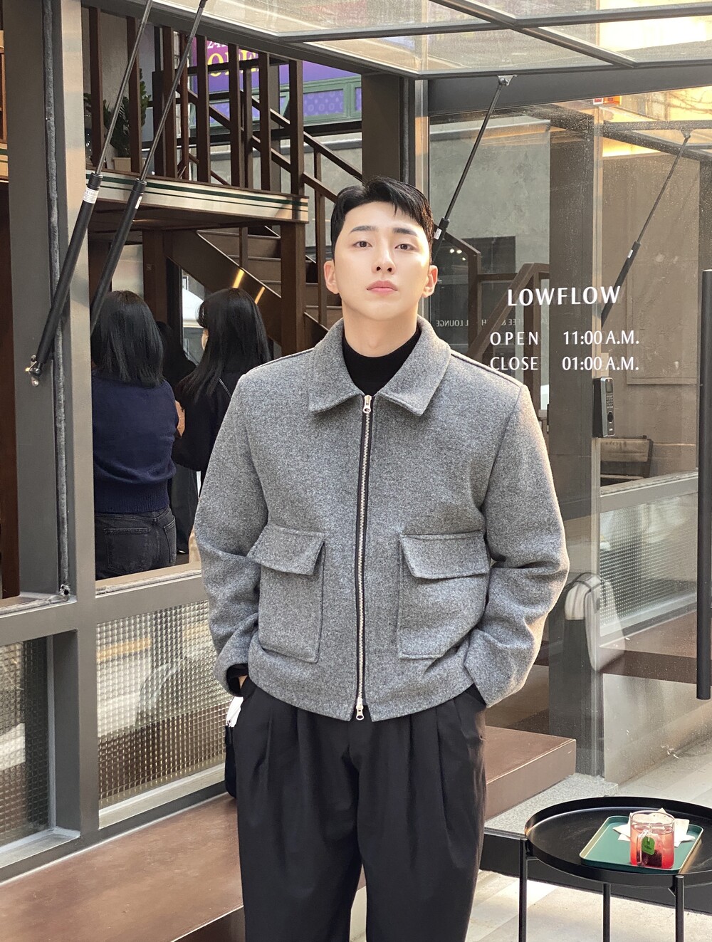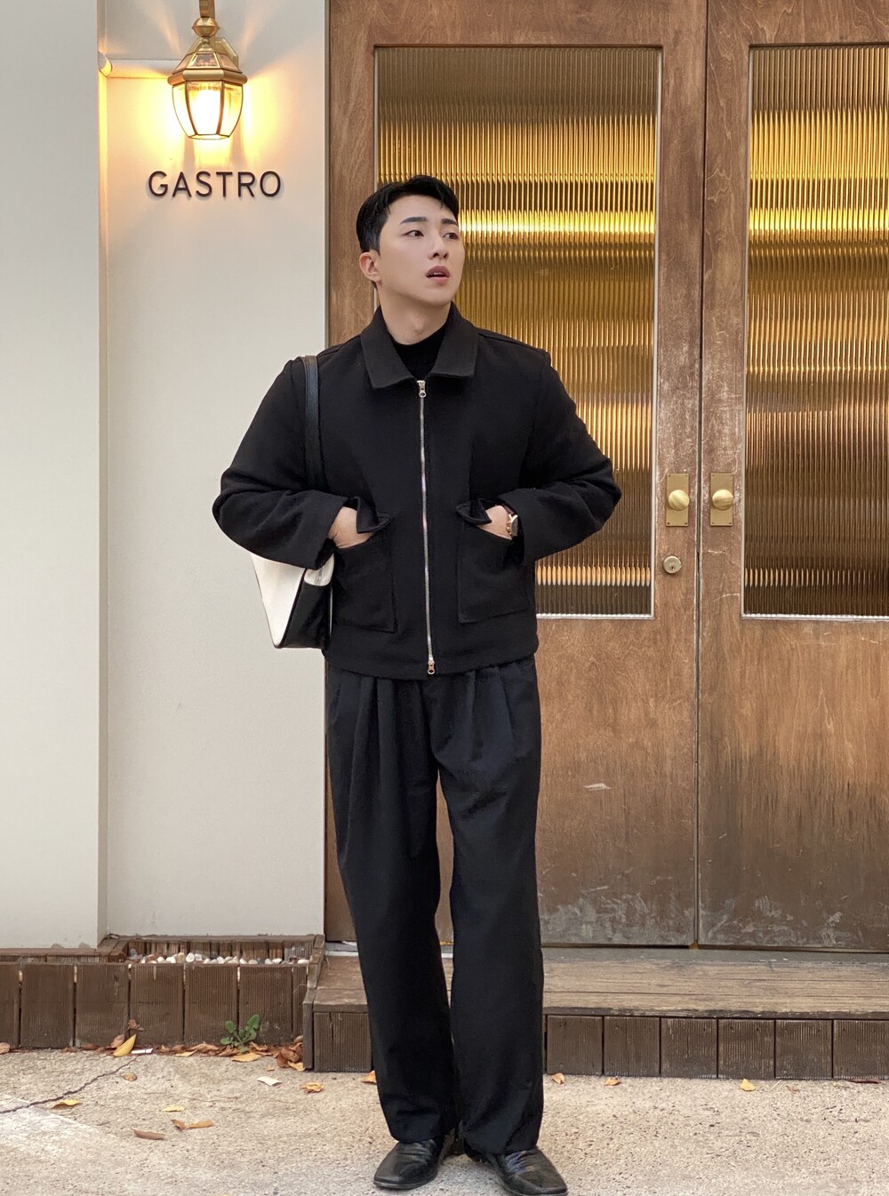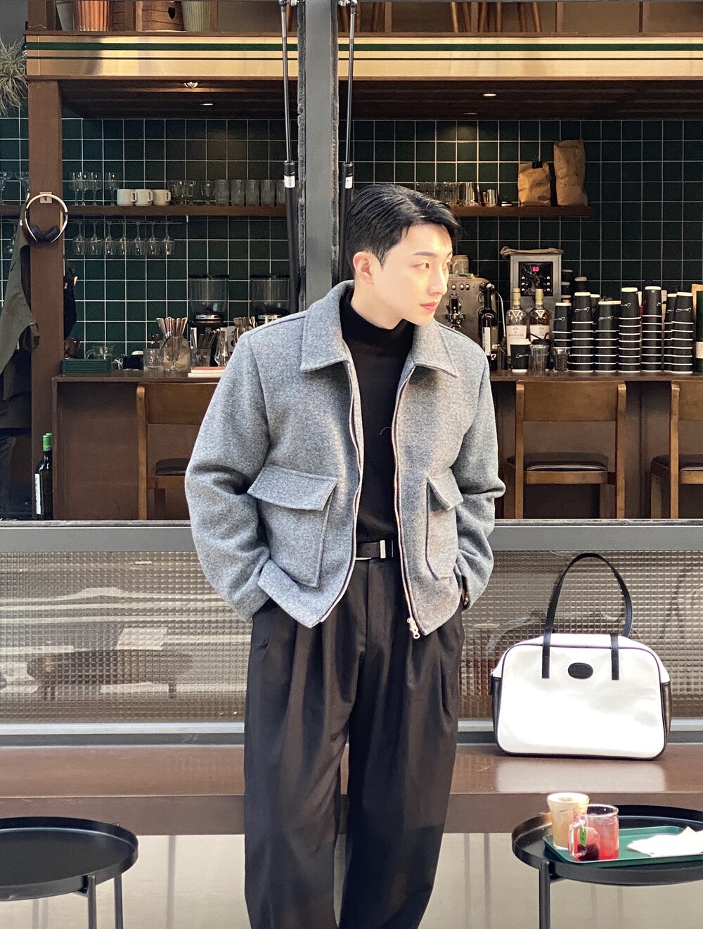 올블랙에 그레이 자켓 걸치면 끝.