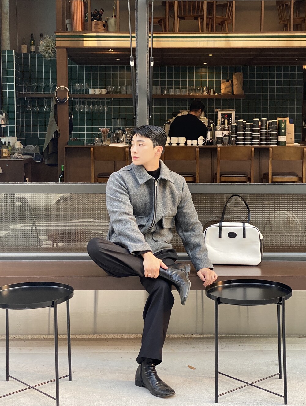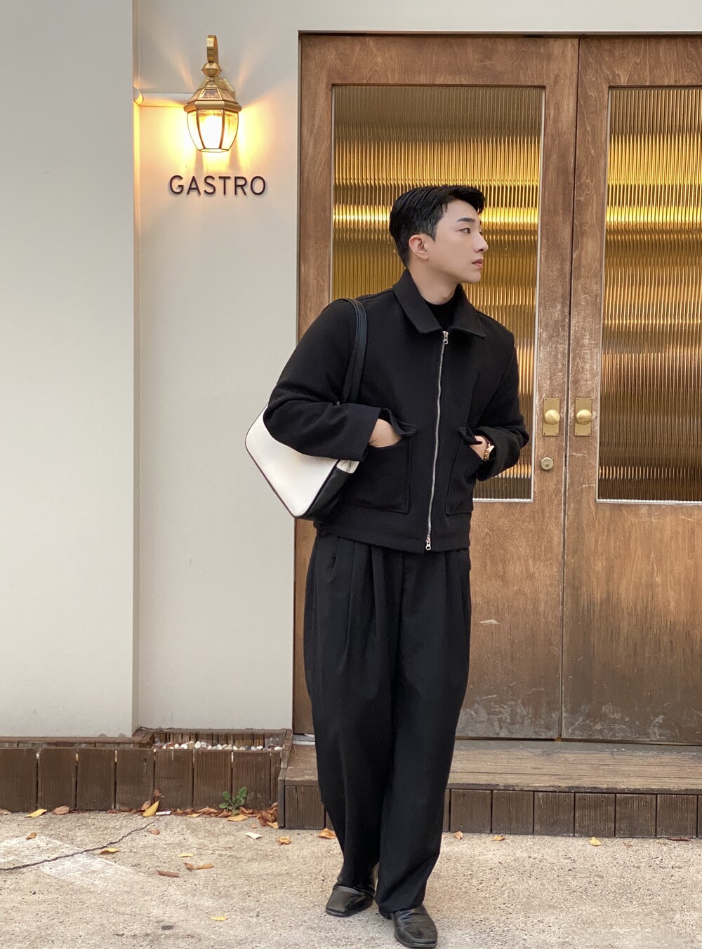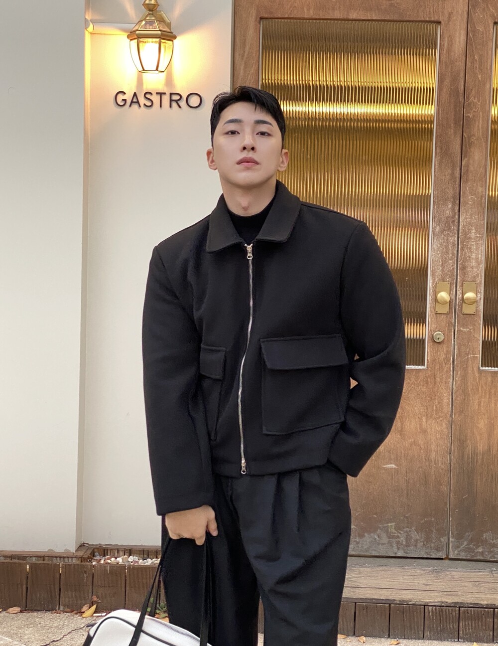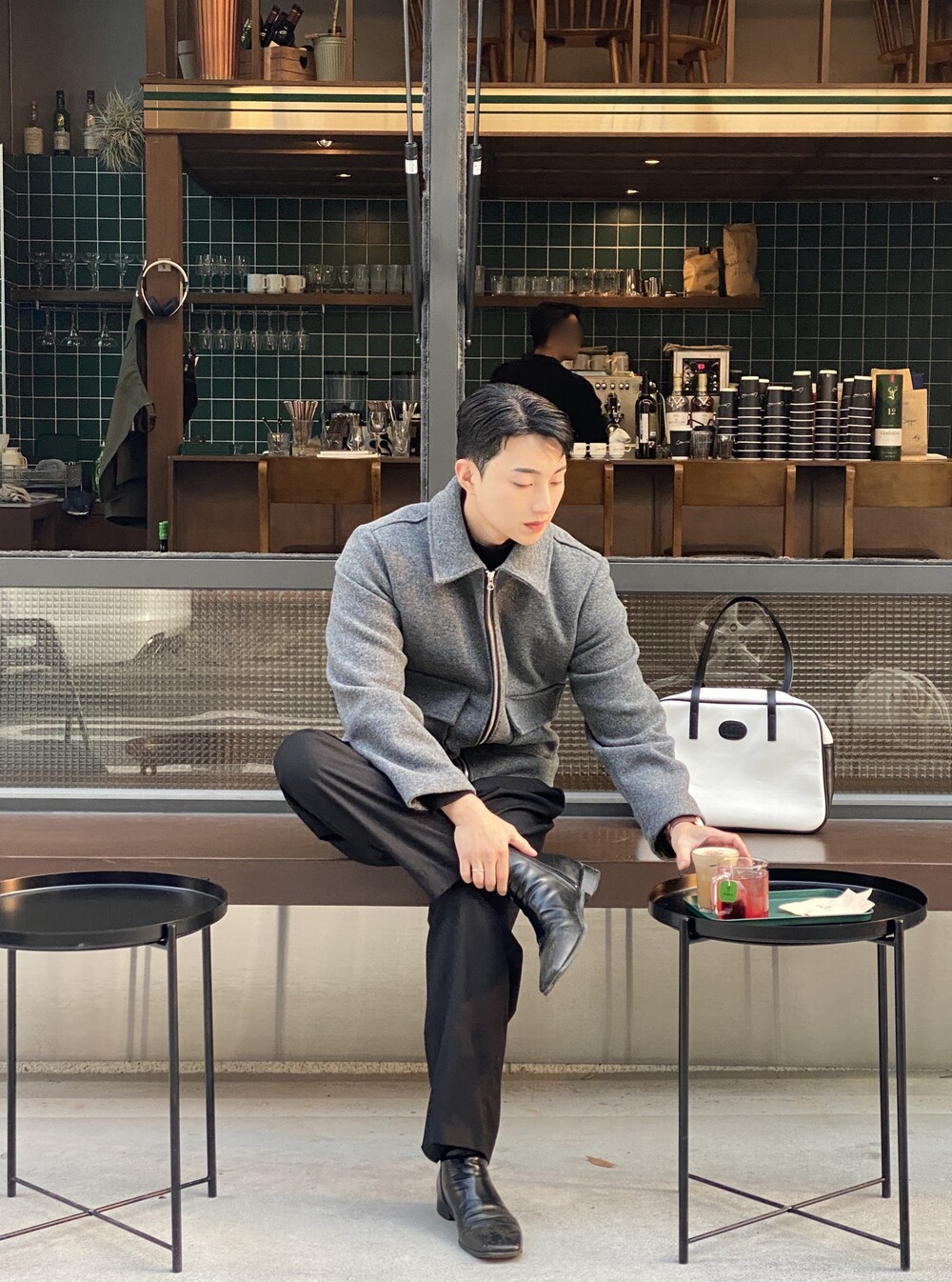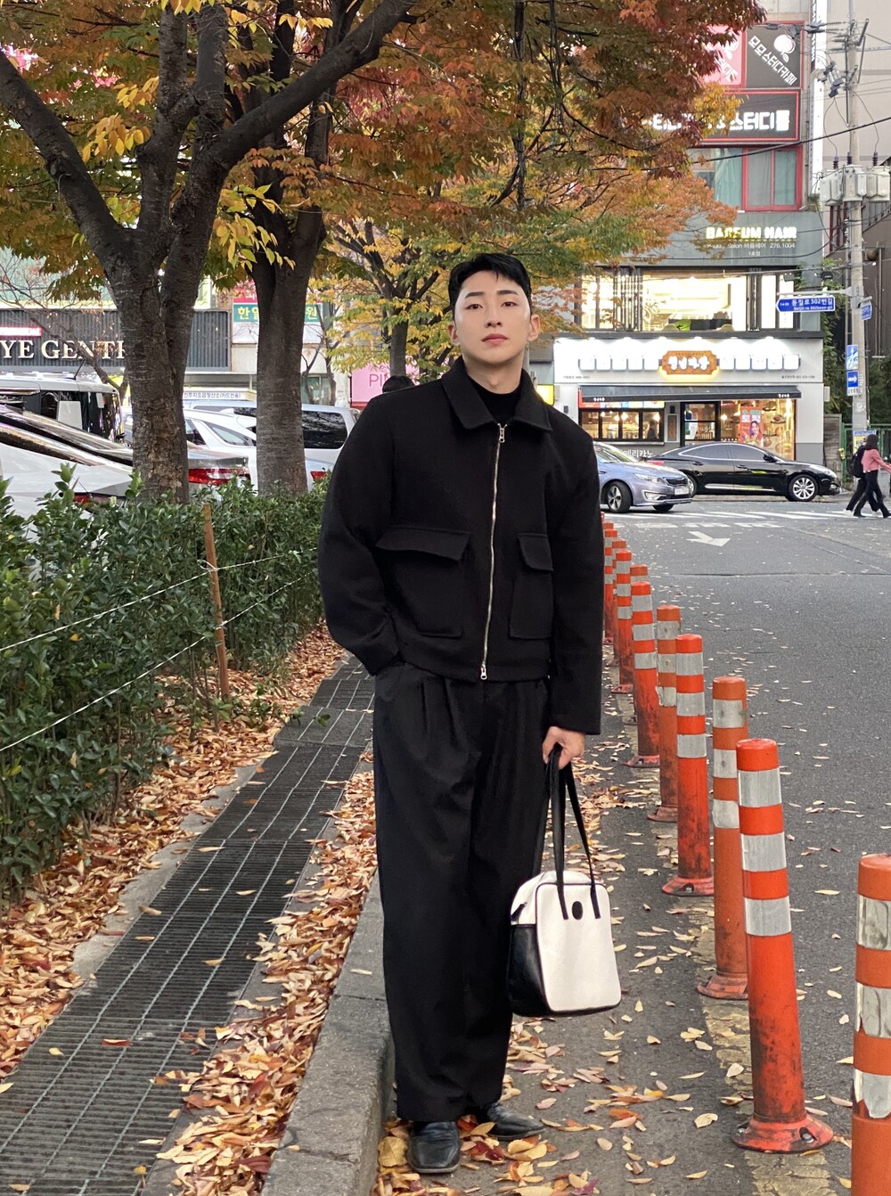 올블랙에 그레이 자켓 걸치면 끝.