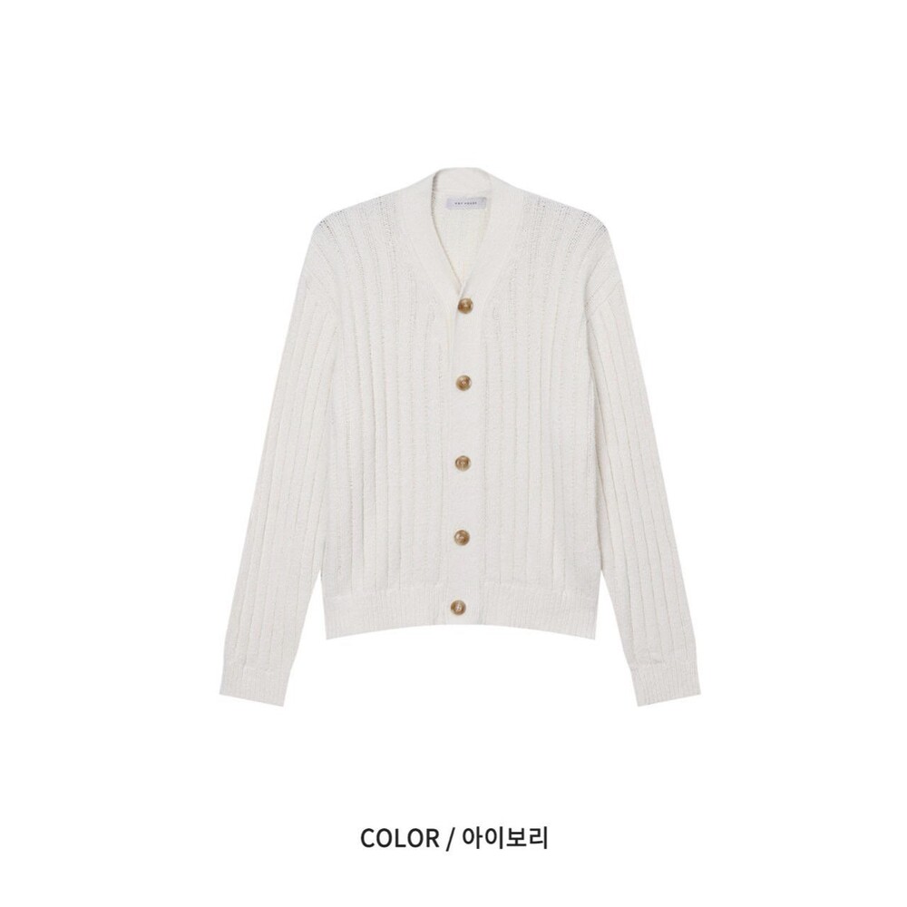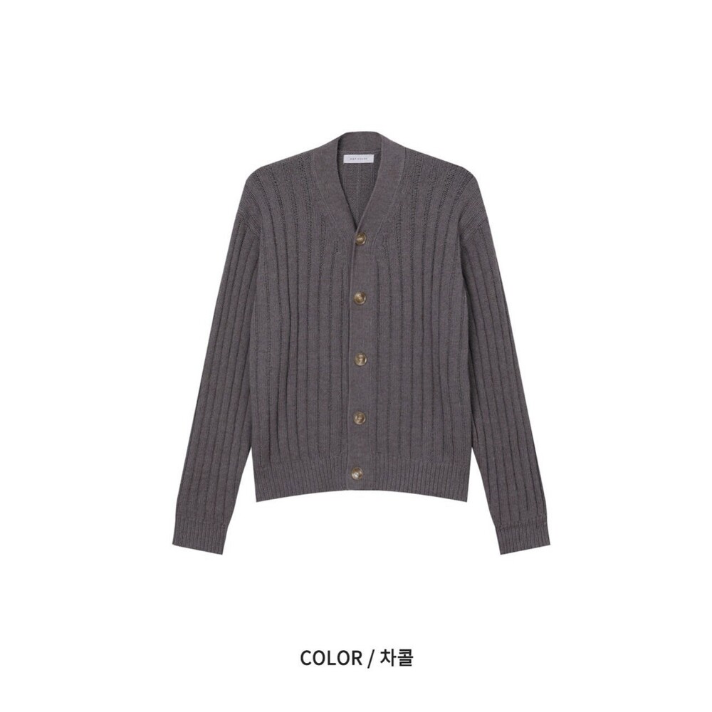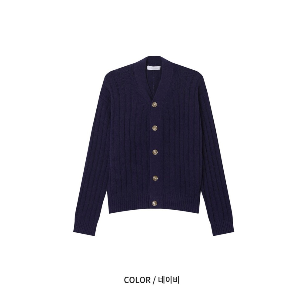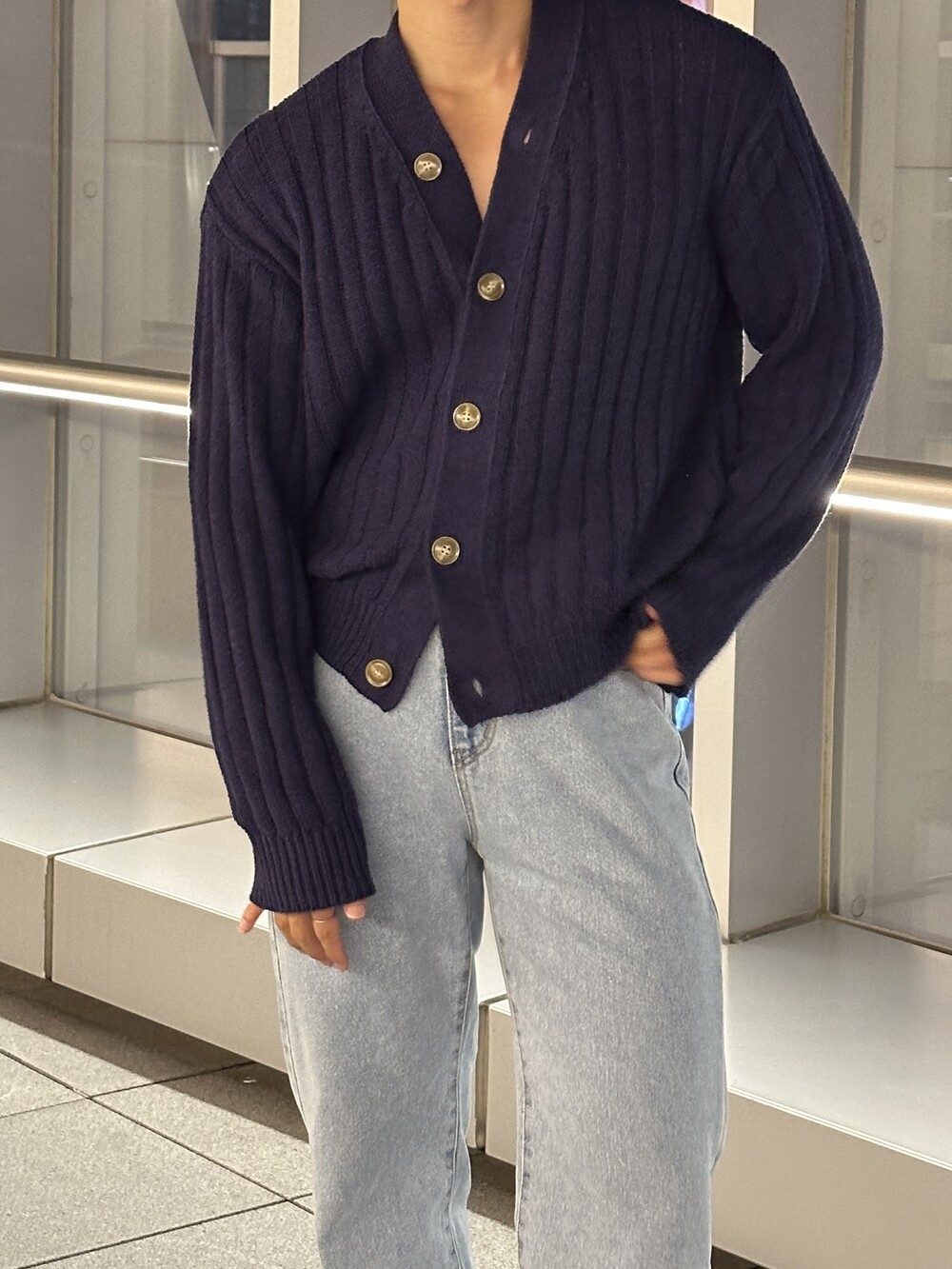 -넥 부분에 포인트 단추가 추가 된 깔끔한 가디건 니트