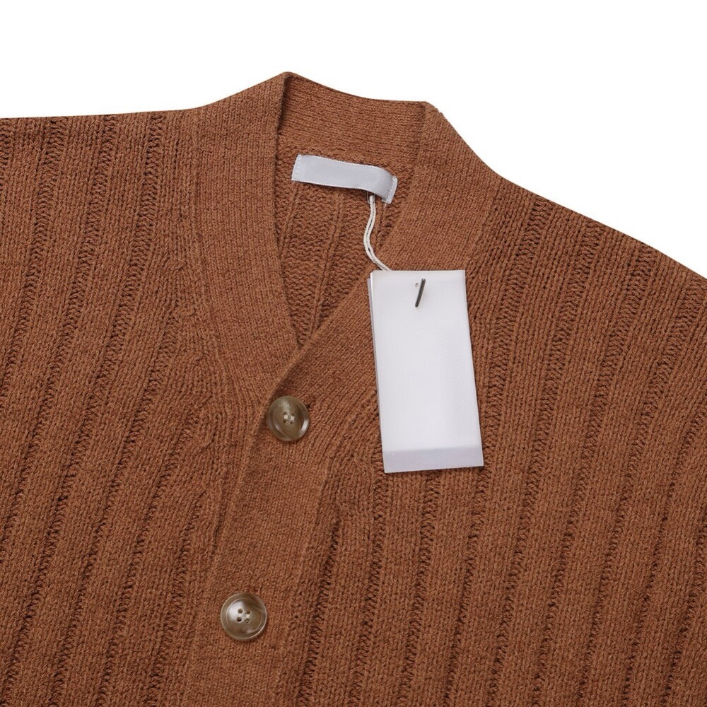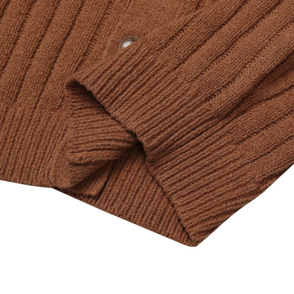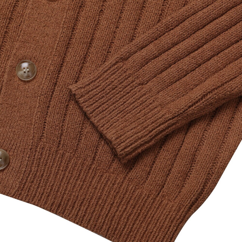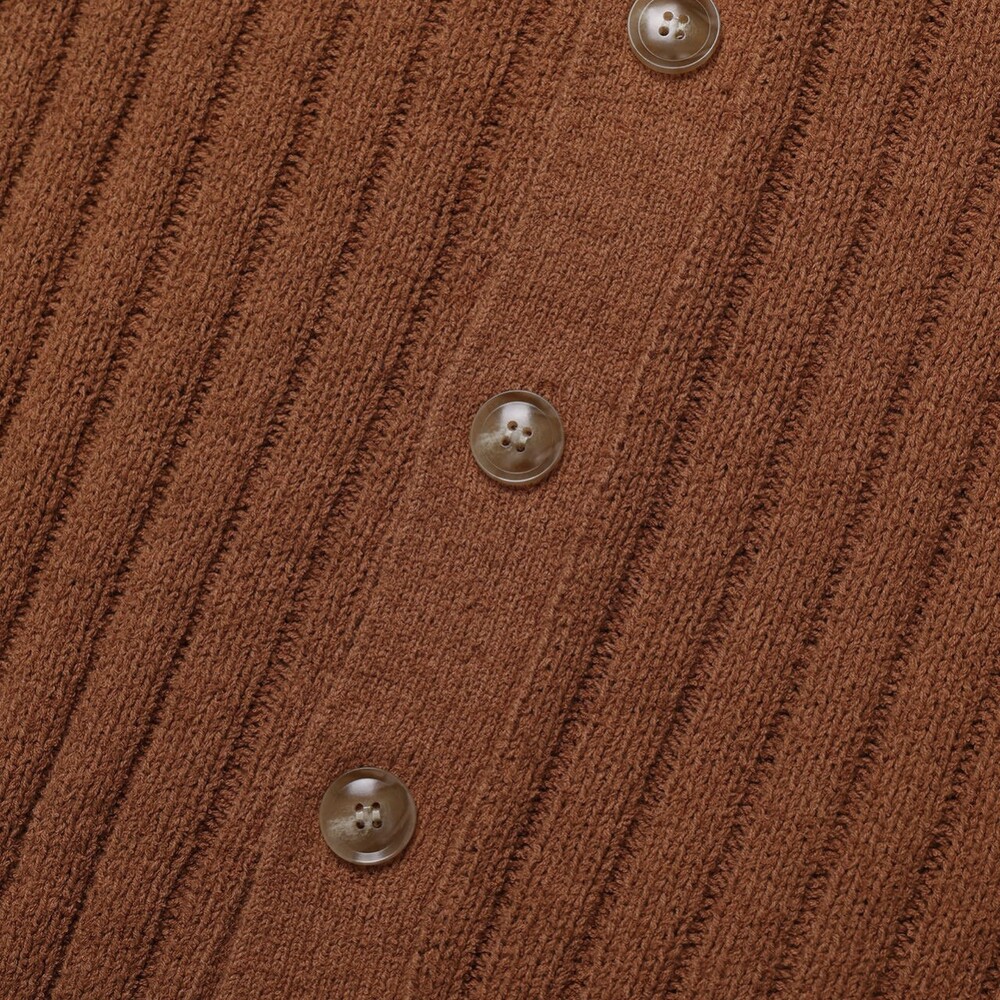-넥 부분에 포인트 단추가 추가 된 깔끔한 가디건 니트